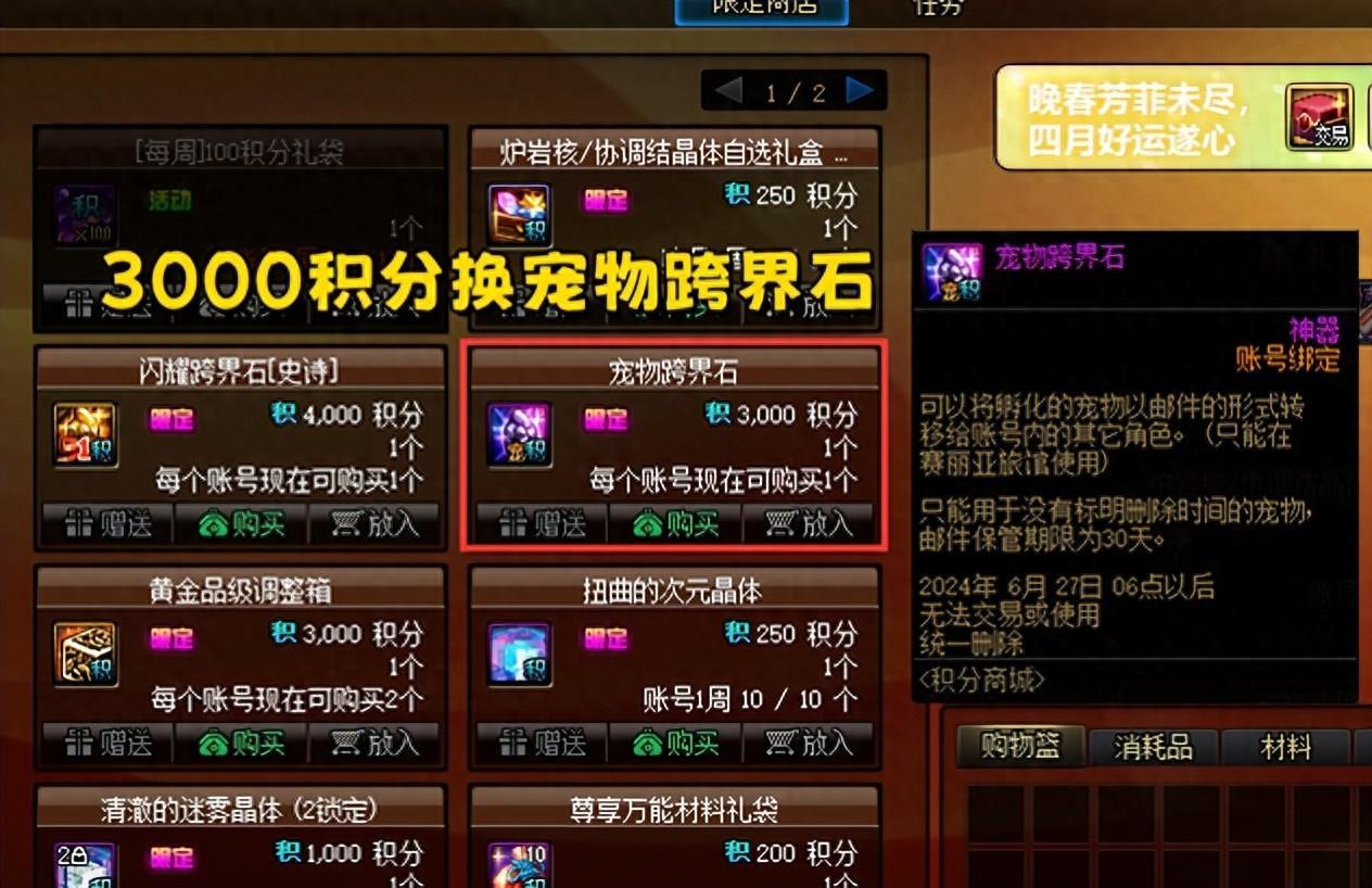 【1】積分商城新增“寵物跨界石”,3000積分兌換1個,每個賬號均可兌換一次。