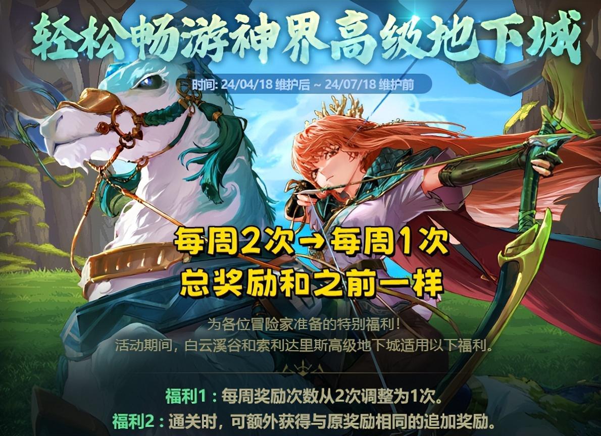 【3】高級地下城減負,主要是“白雲溪谷”和“索利達里斯”,每週獎勵次數從2次調整爲1次,不過獎勵數量翻倍。