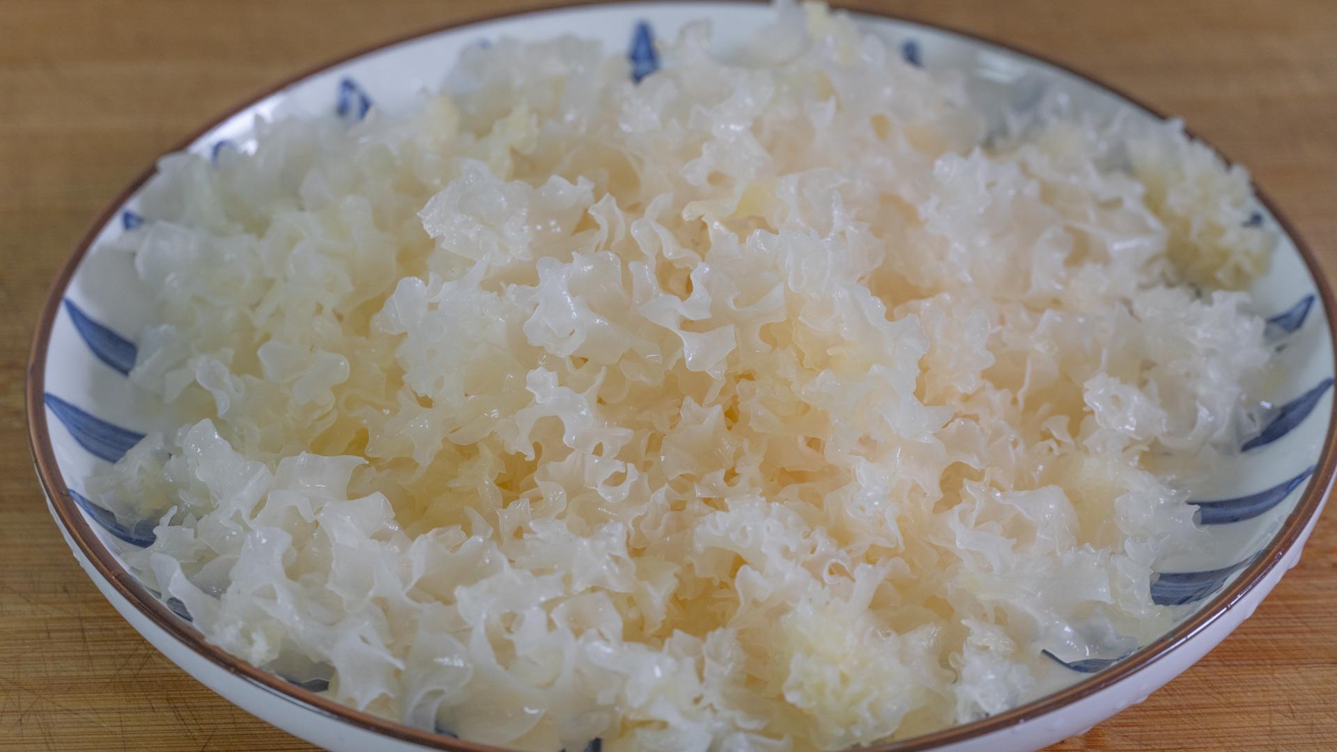 2、銀耳泡發好之後,將銀耳清洗乾淨,用剪刀將銀耳剪碎。