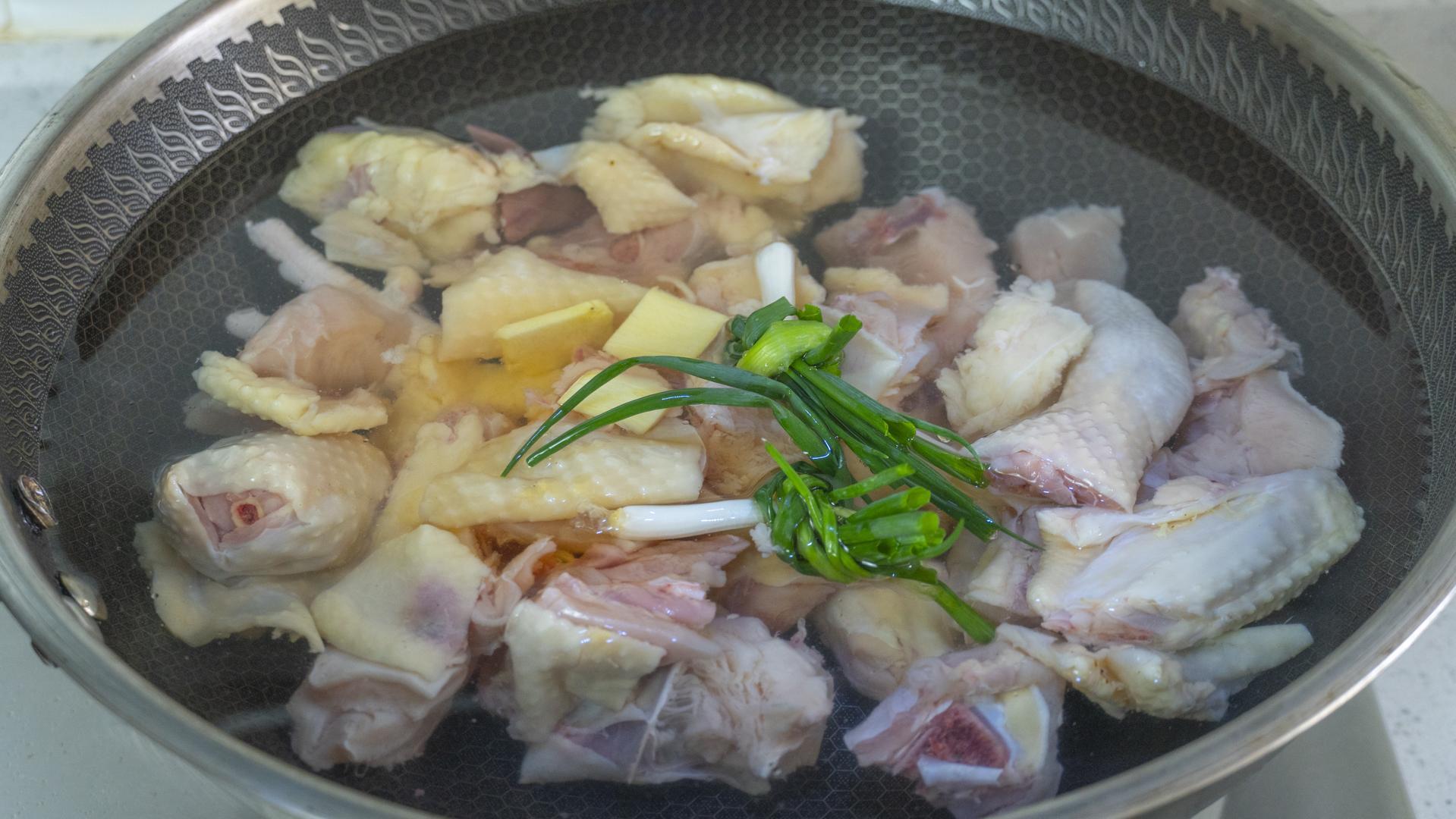 2、新鮮的土雞半隻剁成大塊兒,起鍋燒水,冷水下雞肉焯水,加蔥姜料酒去腥。