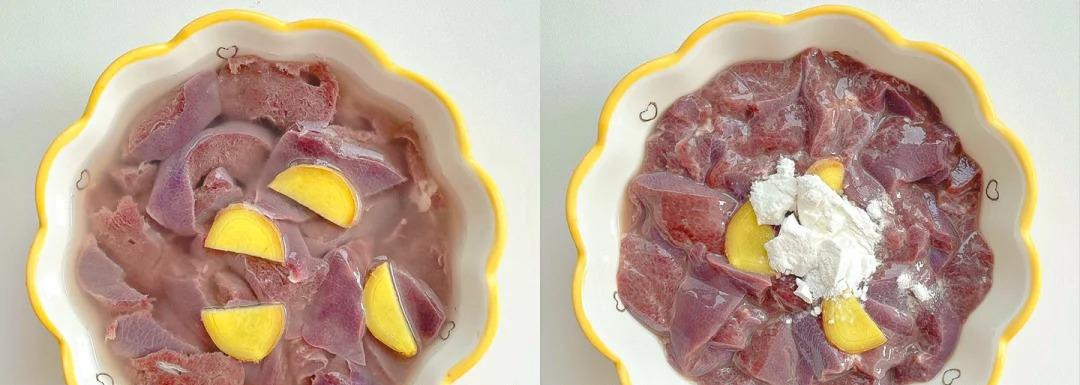 2、豬肝用清水浸泡半小時,洗淨後切片,加澱粉、生抽、胡椒粉拌勻醃10分鐘。