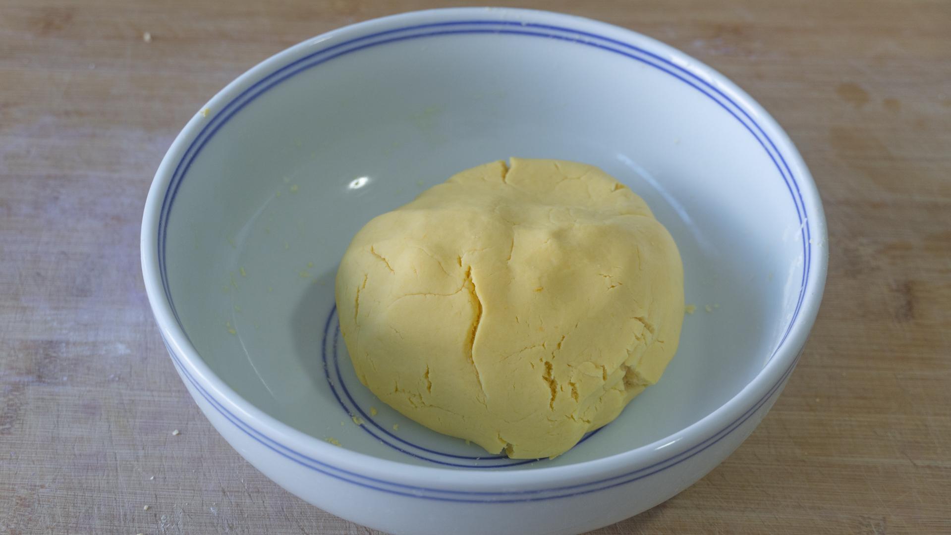 4、趁熱再加20克白糖搗成細膩的南瓜泥,接着加300克木薯澱粉,攪拌均勻後下手揉麪,先基本地揉成一個麪糰兒。