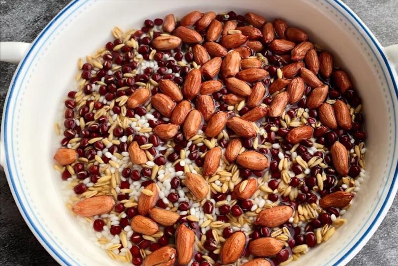 1、紅豆、花生、燕麥、糯米混合在一起放大碗中淘洗乾淨備用。