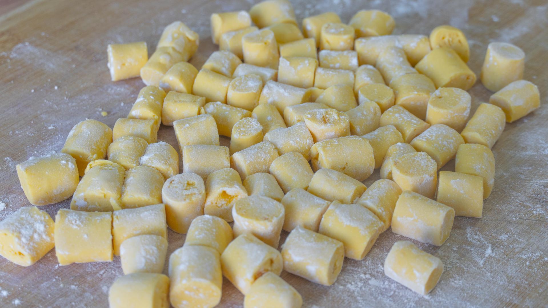 6、撈出來後放回剩餘的麪糰兒裏面揉光滑,揉好後取出來移到砧板上,分成小份後搓長條,再切成小面劑子,接着撒點乾麪粉防粘,芋圓生胚就做好了。