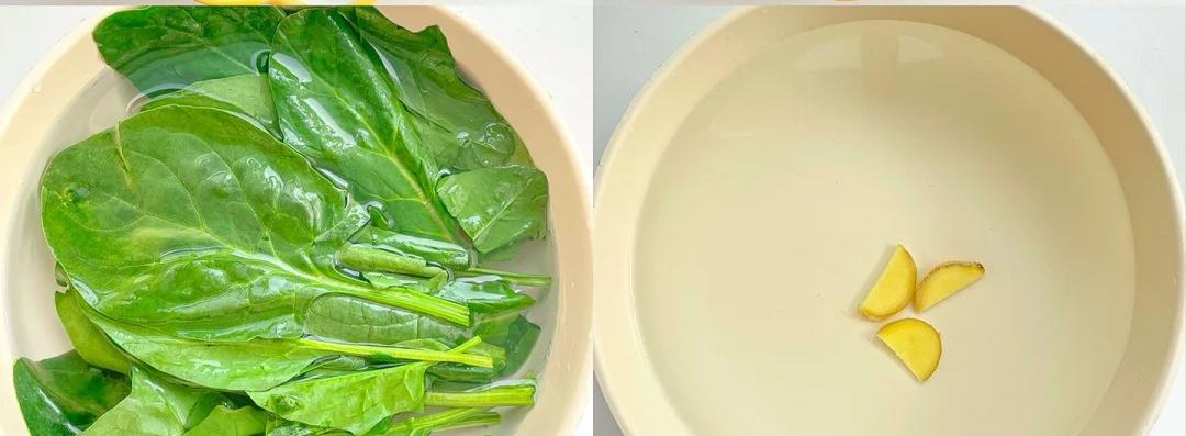 3、菠菜入沸水汆燙半分鐘後,撈出瀝乾。