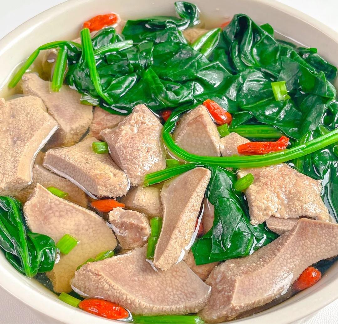 5、鍋中倒入清水或高湯煮開,放入薑片及豬肝煮1分鐘,再加入菠菜、枸杞,調入鹽及香油即可。