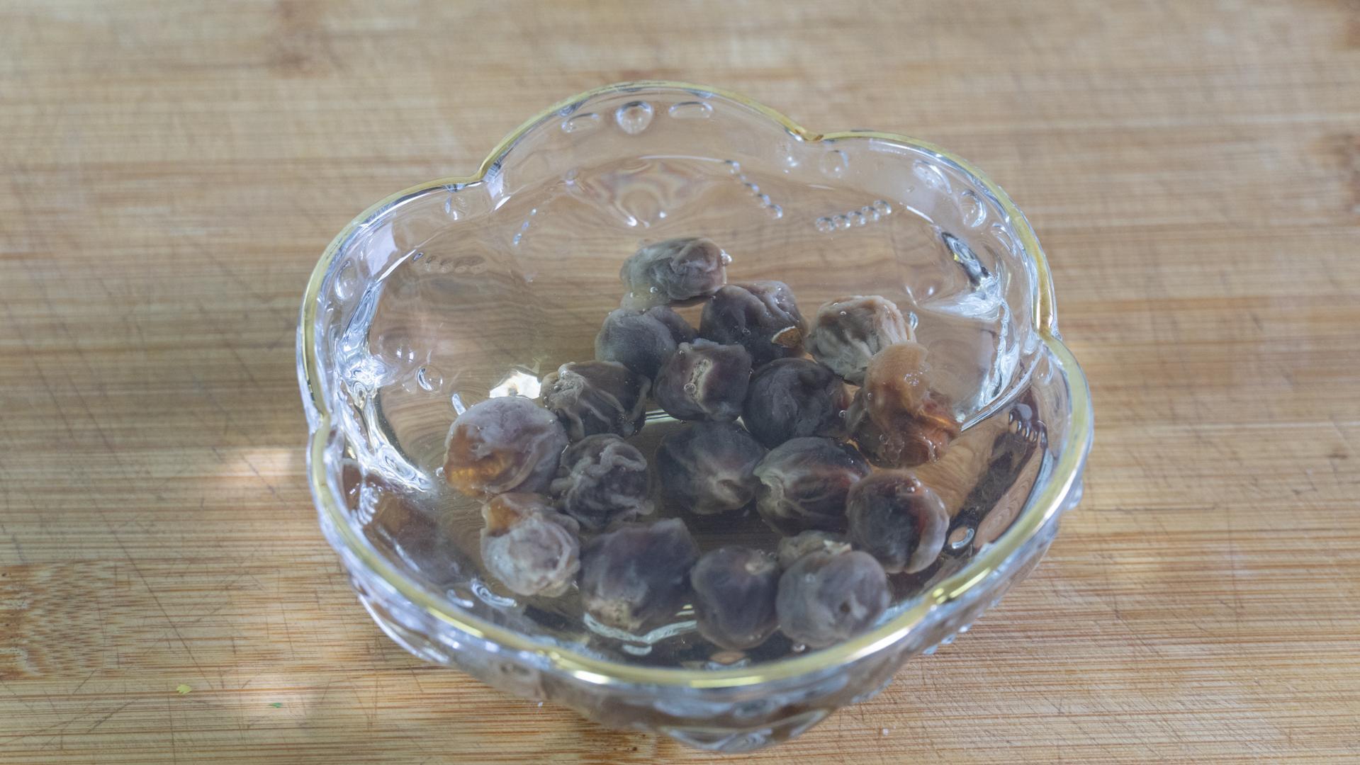 4、幹桂圓1把,剝開後取出桂圓肉,然後加點溫水泡10分鐘。