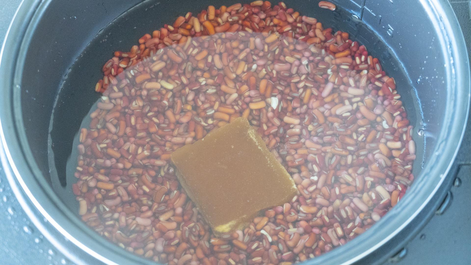 2、赤小豆泡好後加一片紅糖,蓋上用煮粥功能開始煮。