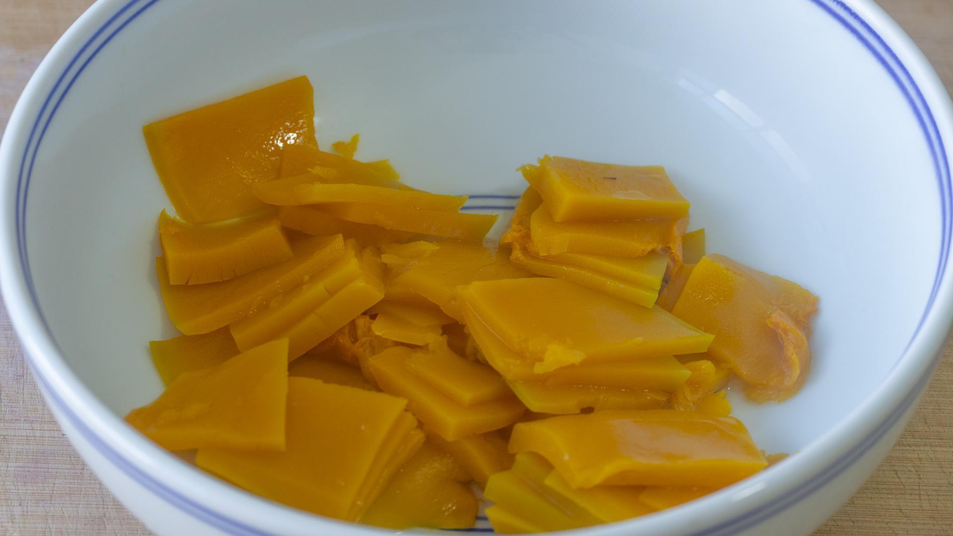 3、南瓜200克,去皮後切片,然後裝入盤裏上鍋蒸熟。大火15分鐘就可以了,完全熟透後倒出來。