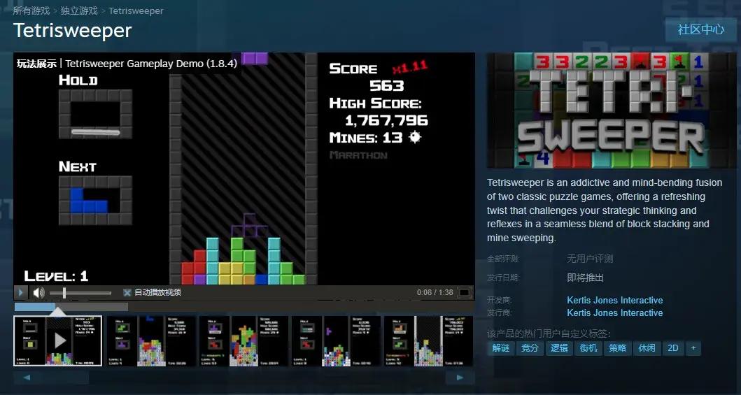 今日,一款名爲《Tetrisweeper》的小體量遊戲上線了Steam頁面,雖然這個遊戲目前還沒有正式的中文譯名,甚至在所支持的語言類型裏也沒有加入中文,但我個人覺得把它直譯成《俄羅斯方塊清道夫》還挺貼切的。