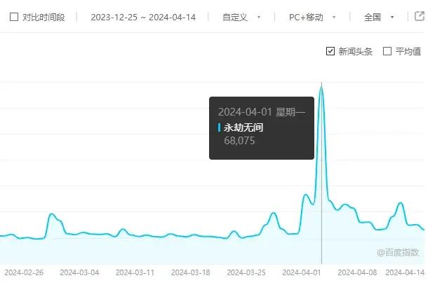 根據百度指數顯示,關鍵詞“永劫無間”今年4月1日的搜索指數達到了峯值