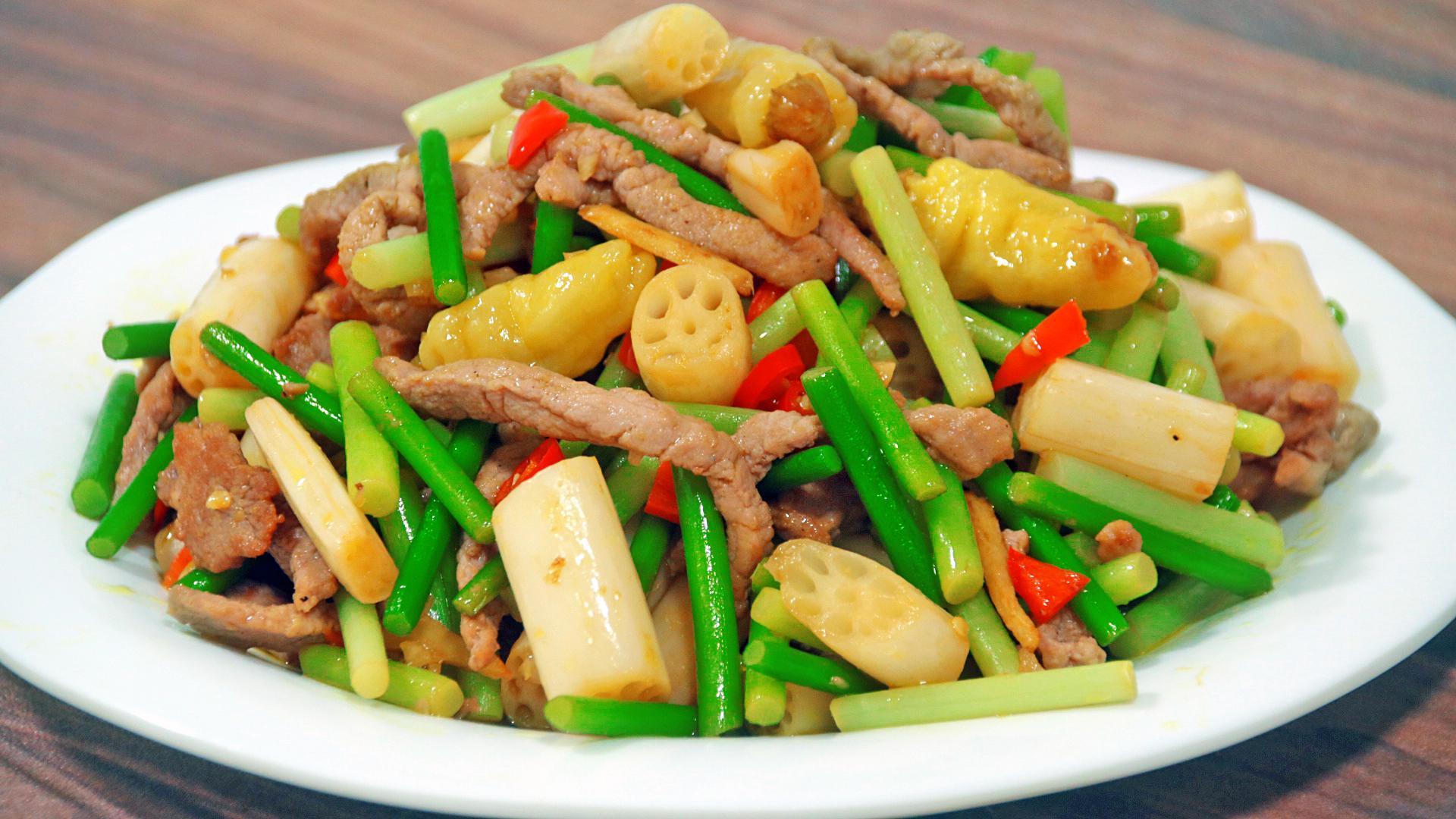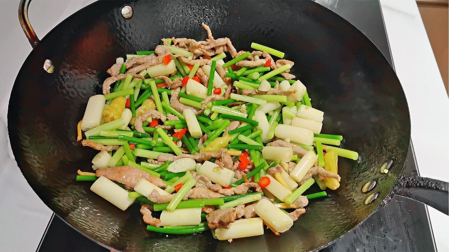 6、藕帶和焯過水的蒜薹一起倒鍋裏面來,調味就加了一點點的鹽、一勺生抽、一點蠔油,大火翻炒幾下,入味就可以了,