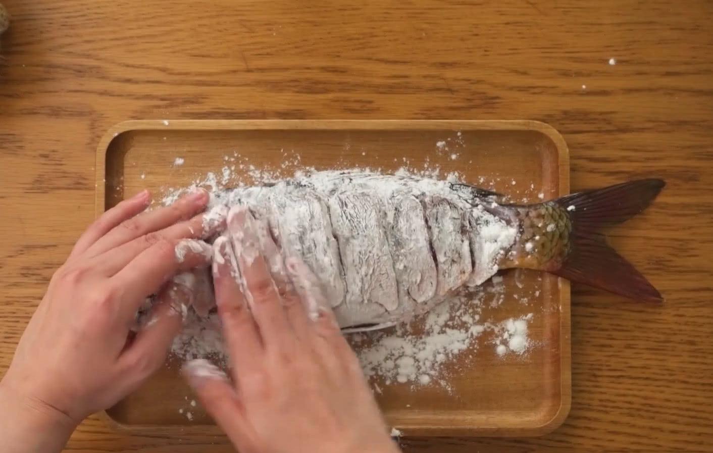 2、在魚身上撒一層面粉,然後再抖掉魚身上多餘的麪粉;