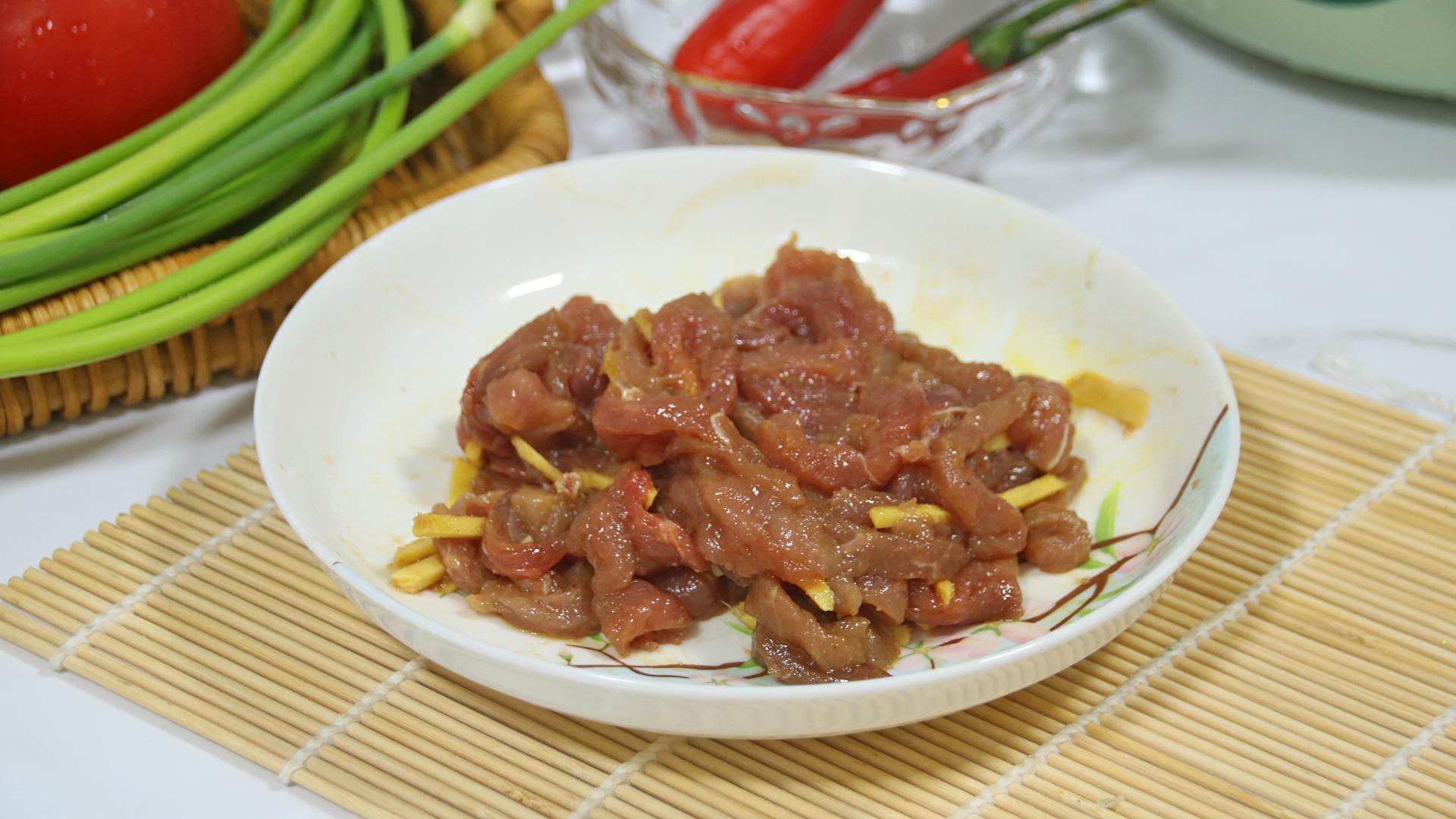2、豬肉改刀切一下,切成絲;再稍微的醃一會兒:來點薑絲、料酒、胡椒粉、醬油、蠔油、澱粉,給它抓拌抓拌,再淋上半勺食用油鎖住水分 ,醃個5分鐘左右就差不多了;