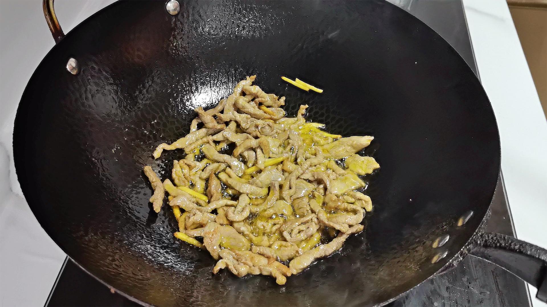 5、起鍋熱油,倒入醃製的肉絲滑散,加點蒜末辣椒丁炒香;