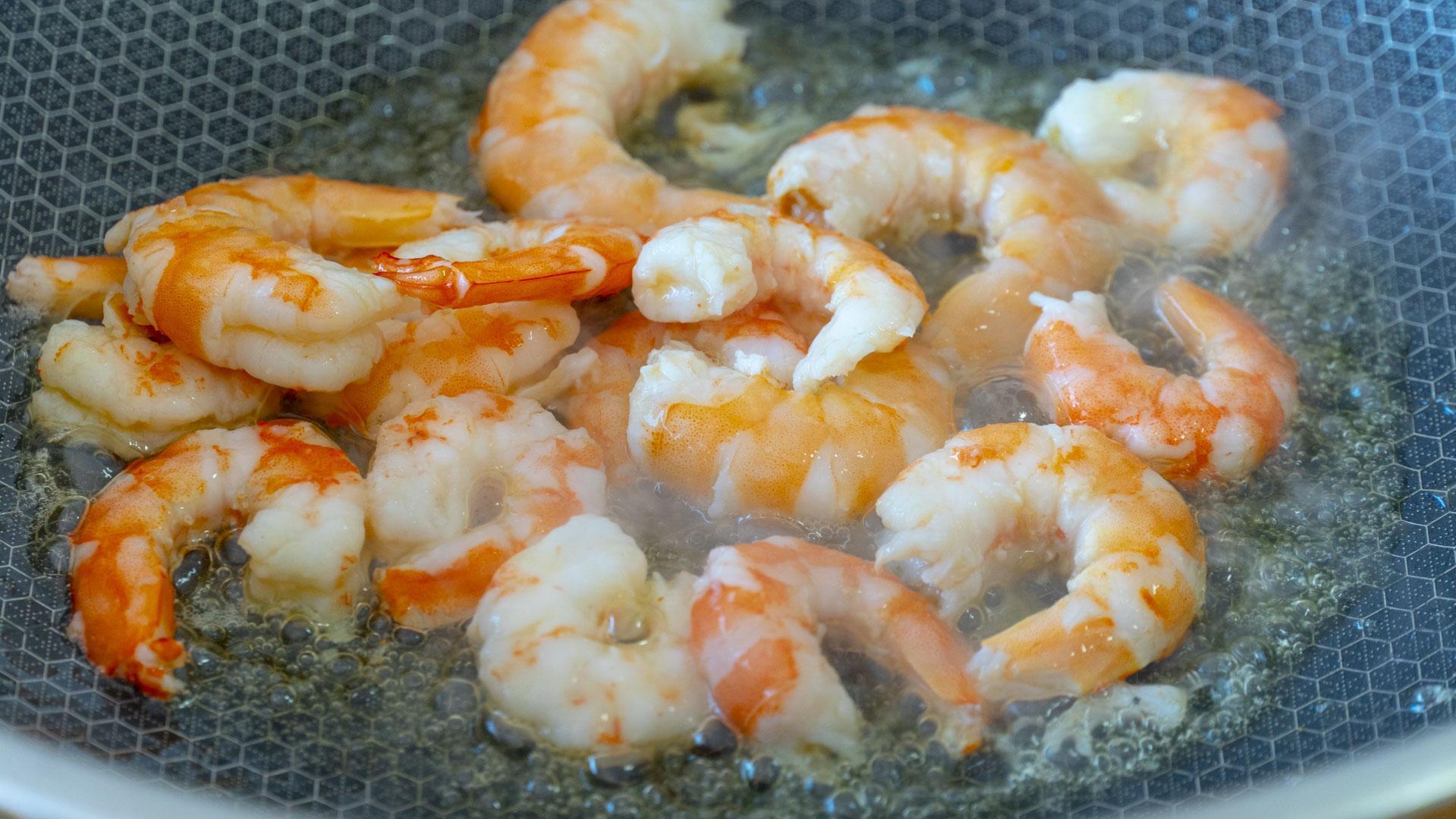 4、起鍋熱油,倒入蝦仁炒一炒。