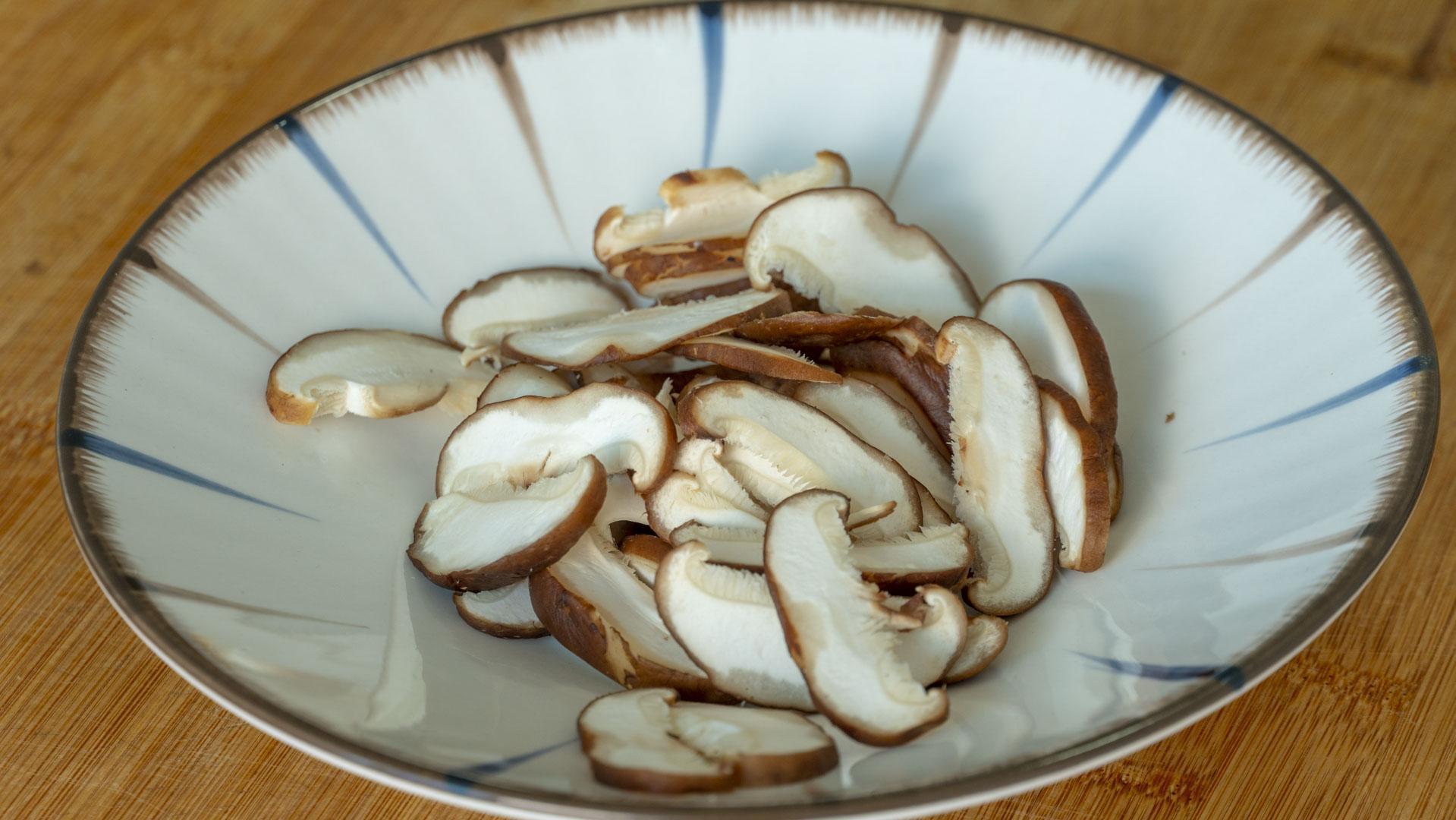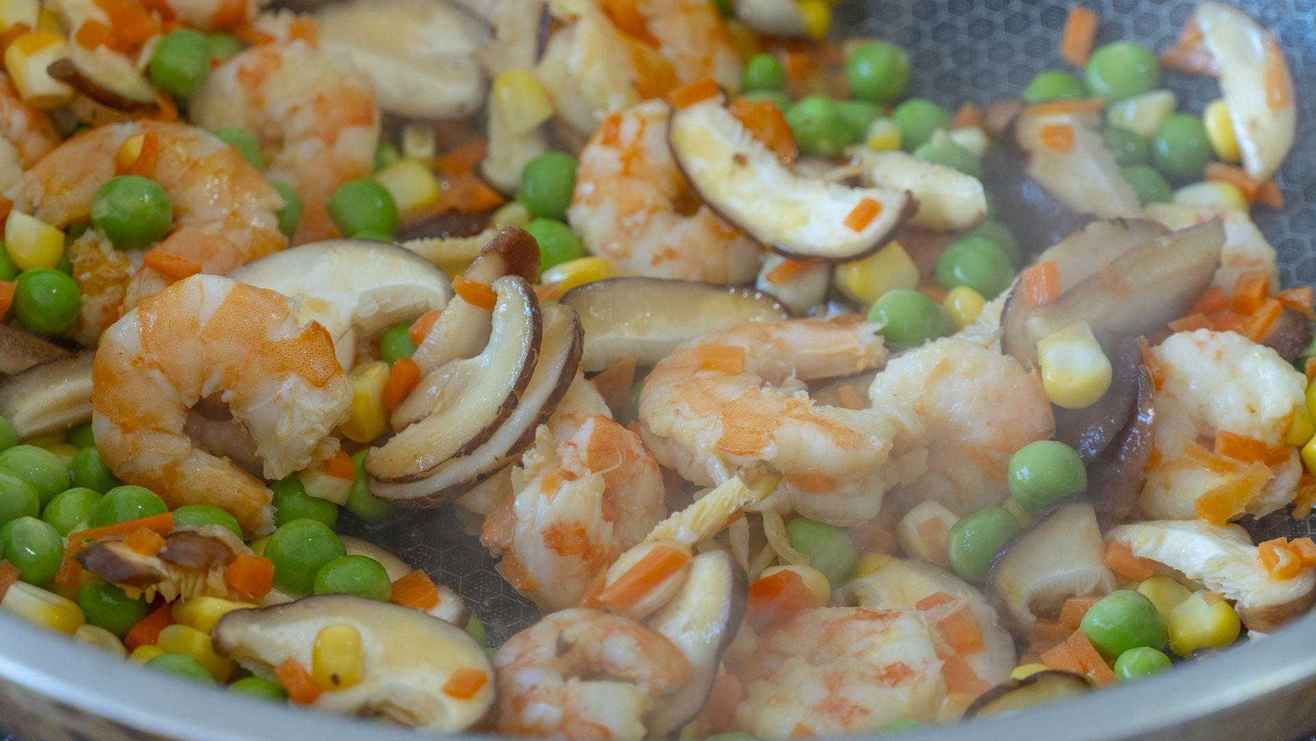 5、再把胡蘿蔔、香菇、玉米、豌豆也倒進來,炒一炒後會更香,盛出來後先放在一旁。