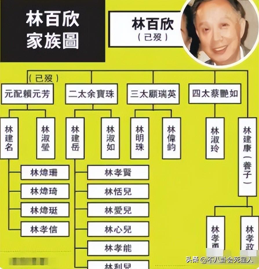 據悉,林百欣原配賴元芳已經離世多年,四太蔡豔茹則是一位臺灣小明星,她嫁入林家後就退圈了,一向比較低調。