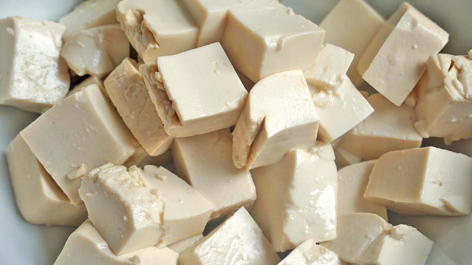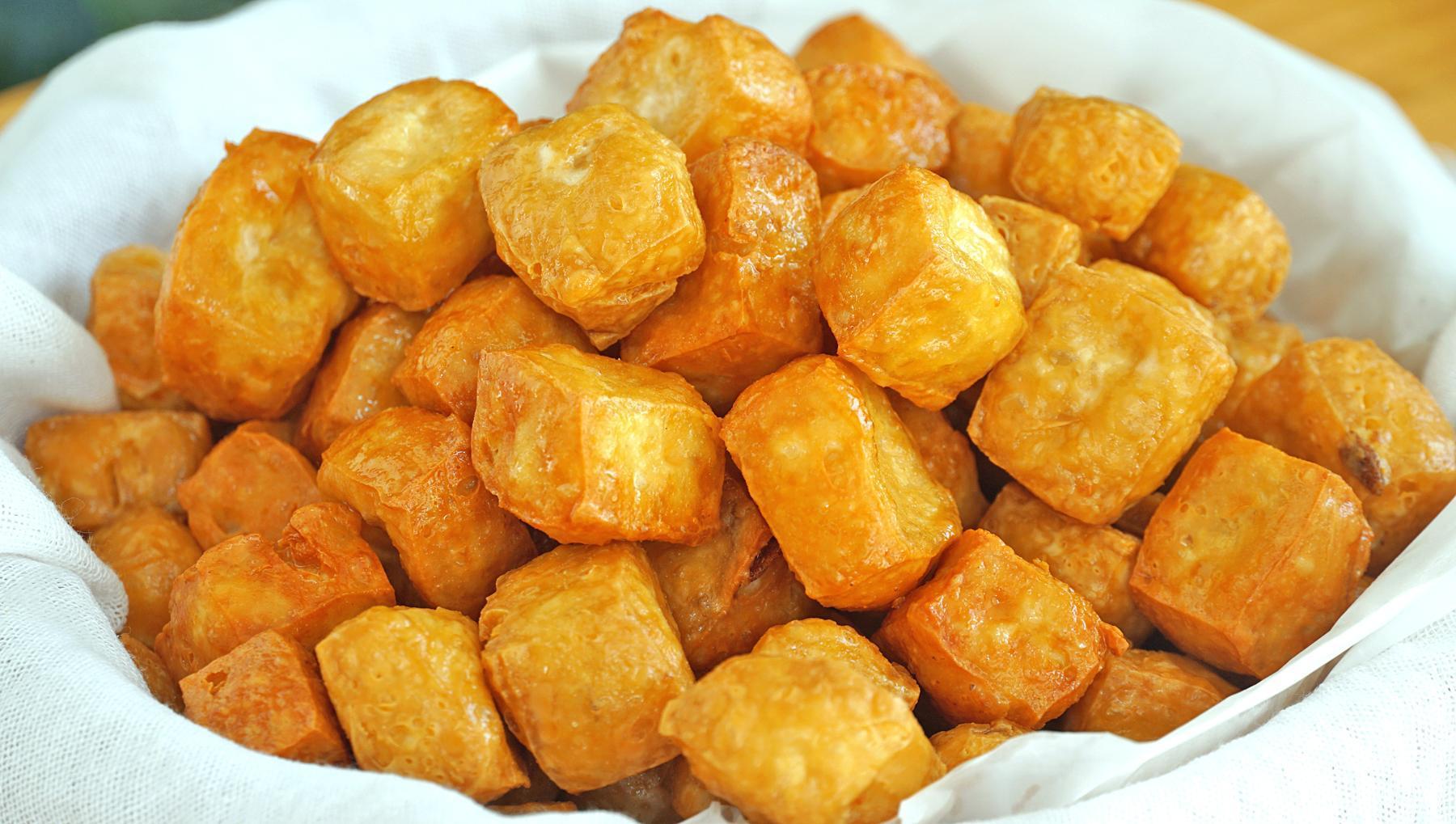 1、我們用豆腐它來炸果子,也就是油豆泡,先把豆腐切成小方塊,不要切太大了,不然不容易炸透。