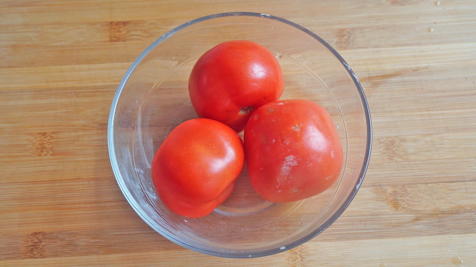 2、西紅柿劃十字口後用開水燙一會兒;