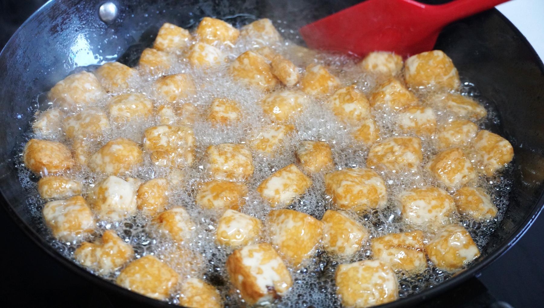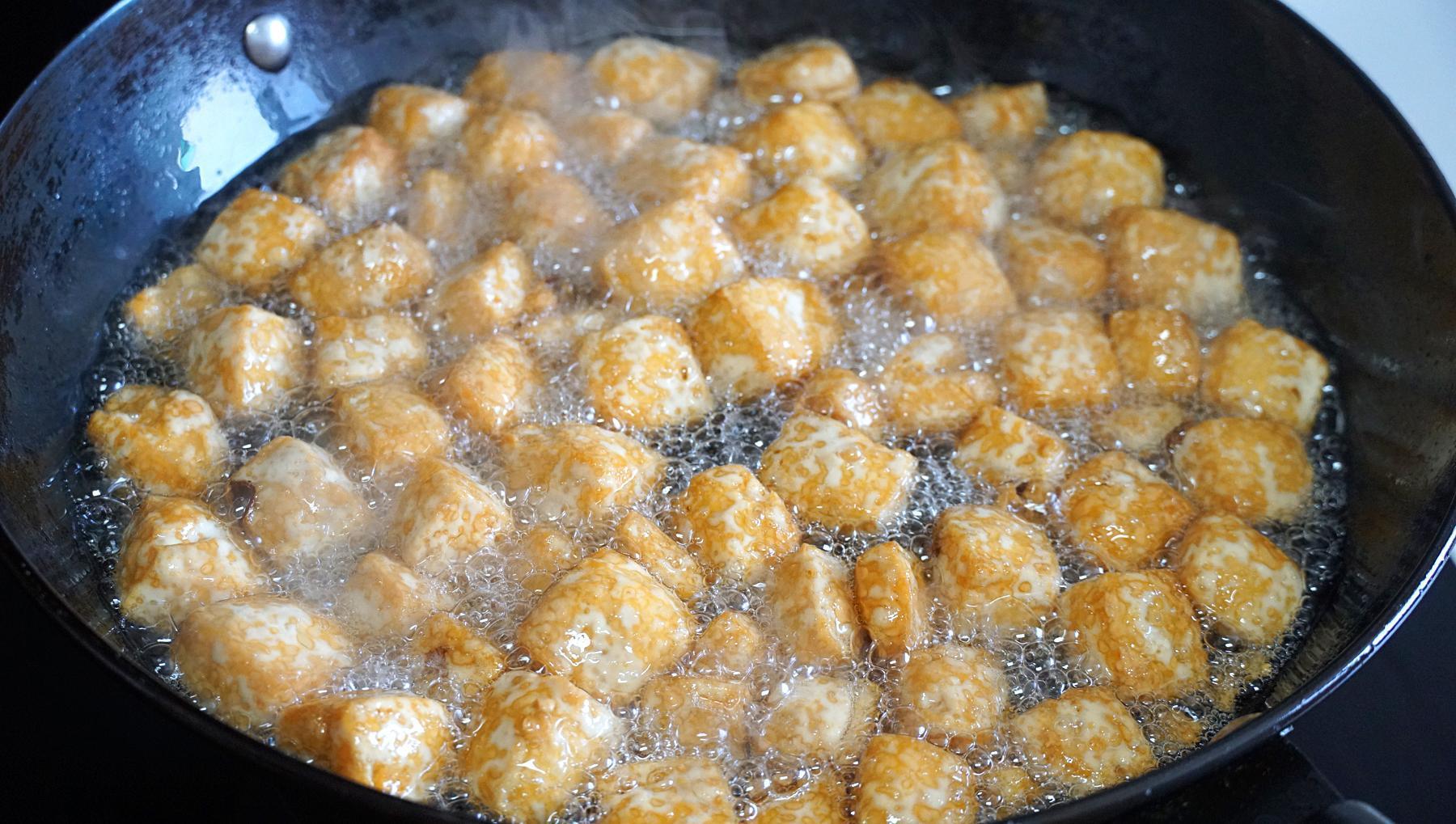 4、讓每一塊兒豆腐都能受熱均勻,慢慢的,豆腐塊就開始變得圓鼓鼓的了。