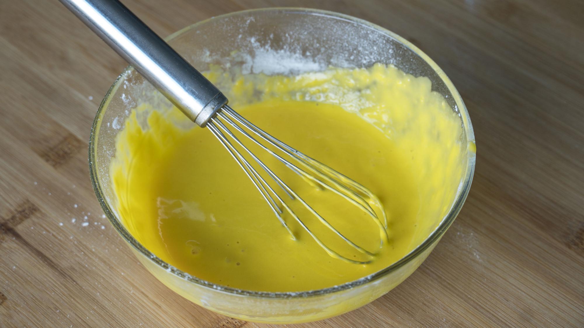 60克低筋麪粉過篩倒入,用手動打蛋器Z字形攪拌至順滑無顆粒狀,像這種狀態就可以了;