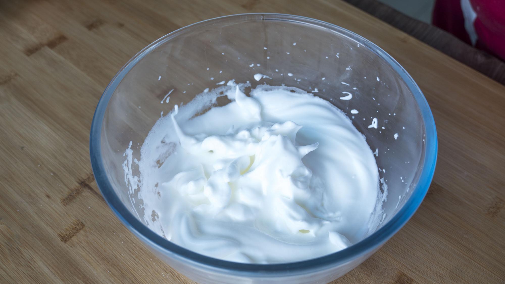 2、現在來打蛋白,先加幾滴檸檬汁,再加三分之一的白糖,打到粗泡加入三分之二的白糖,蛋白裏面總共要加的白糖是20克,轉高速繼續打,打到出現紋路加入剩下三分之一的白糖,繼續用中速打,提起打蛋器有短小的小彎鉤或者是小尖角就可以了;