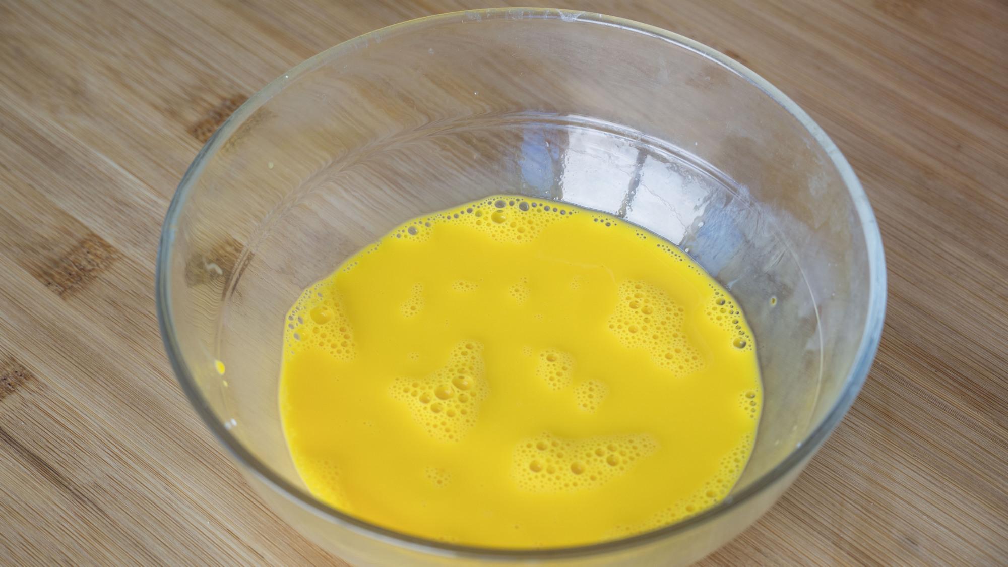 3、打三個雞蛋攪散後加一勺鹽,大半碗溫水,打散後撇去浮沫;