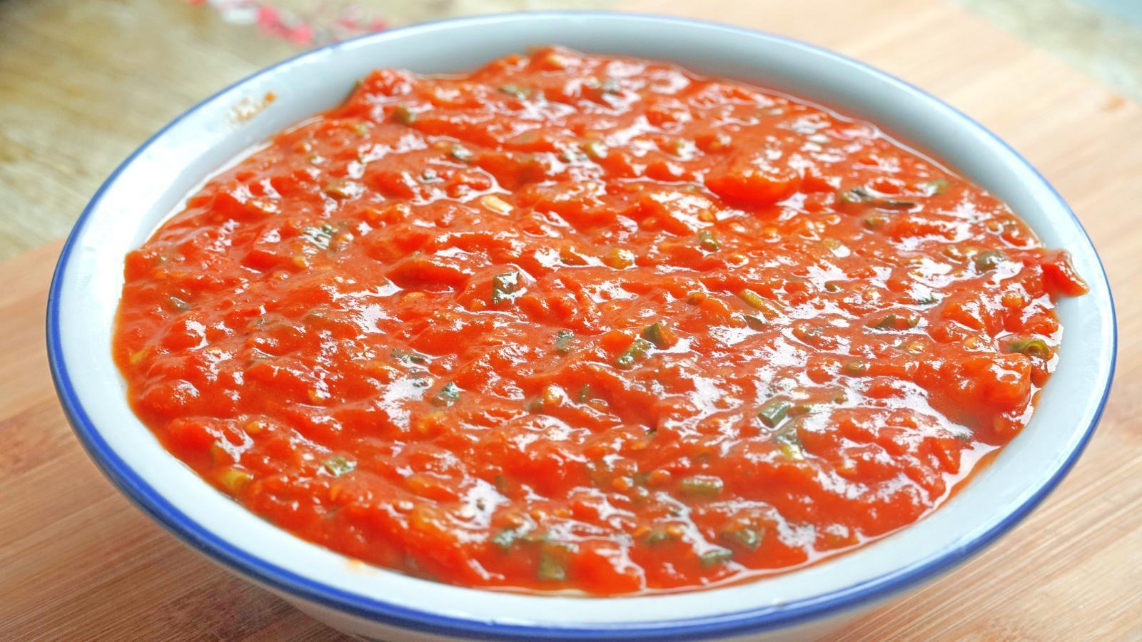 7、我們剛好用蒸豆腐羹的時間來炒番茄醬,鍋里加點油,不用太多,油熱了就把西紅柿倒進去,多炒一會兒,等到它完全地炒出了湯汁後再來調味,一勺生抽、半勺蠔油、一點點的胡椒粉,小火慢慢的炒,炒成濃濃的番茄醬就可以了,出鍋前再來點蔥花;