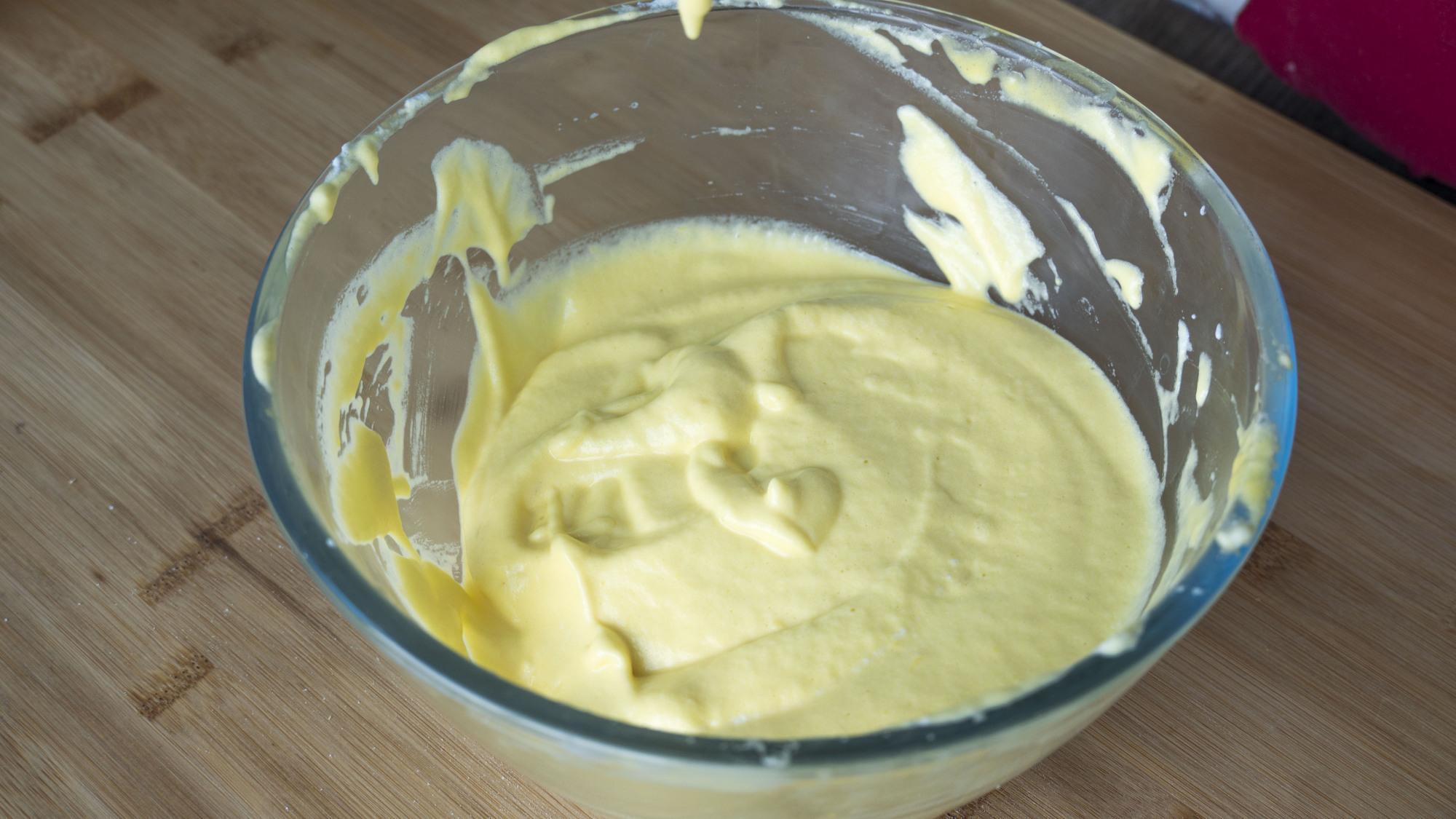 3、取三分之一的蛋白加到蛋黃糊裏面,快速翻拌均勻,混合好後直接倒入三分之二的蛋白裏面,麪粉糊攪拌的時候和前面一樣,速度可以快一點,而且動作要輕一點,翻拌均勻;