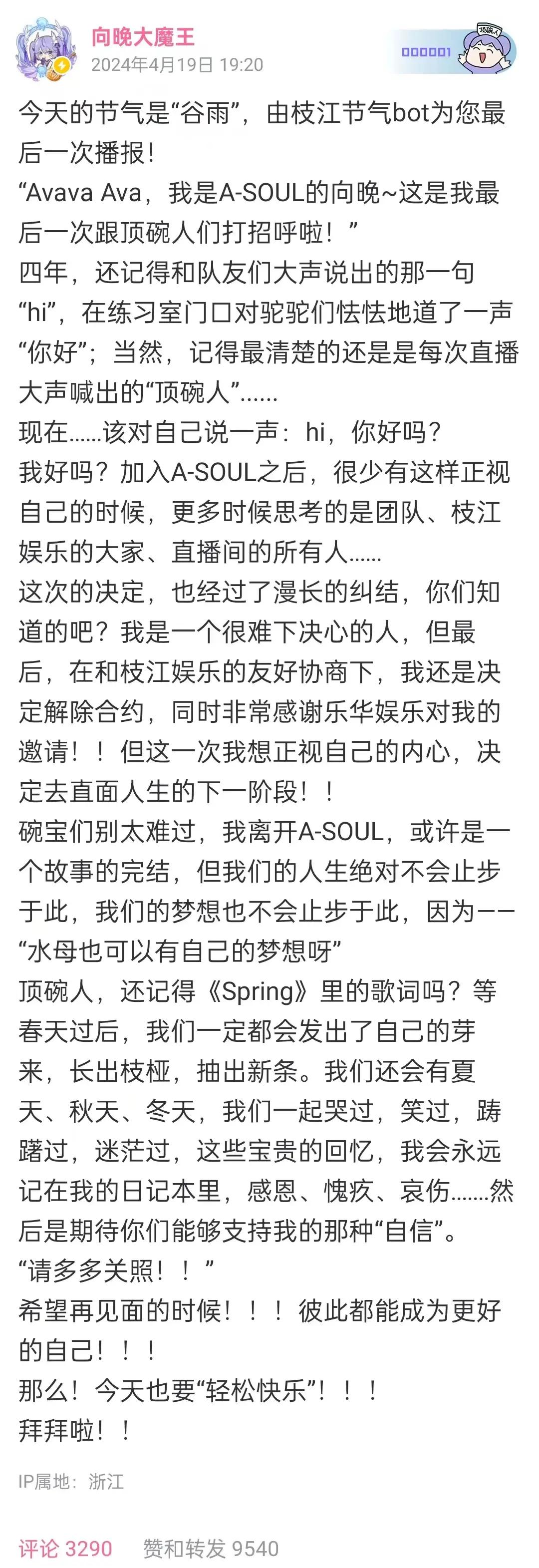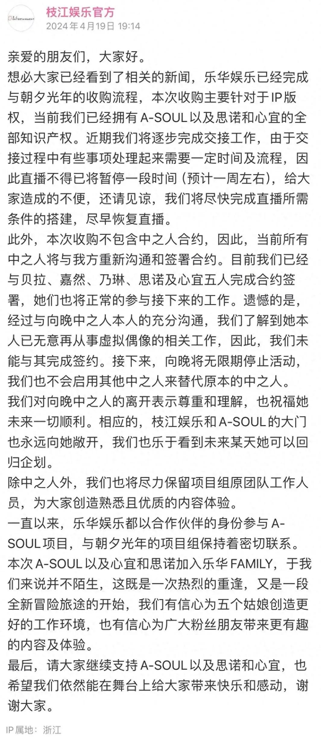由於此次收購不包含中之人的經紀合約,經過溝通後,A-SOUL原成員貝拉、嘉然、乃琳、思諾及心宜五人完成了新合約的簽署,向晚中之人則已無意再從事虛擬偶像的相關工作,並未簽約,向晚的賬號將無限期停止活動,該賬號也在轉發該公告後在B站發佈了兩條告別形式的動態。