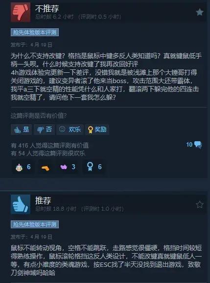 不過目前遊戲的整體評價僅呈現“褒貶不一”,大部分玩家稱本作畫面不錯,作爲動作遊戲打擊感也尚可,但鍵鼠操作設計反直覺,加上無法改鍵讓玩家頗爲不適。另外或許是爲了遊戲難度考慮,玩家的回血設計也甚是令人不爽,整體體驗充滿了開發者的“惡意”。