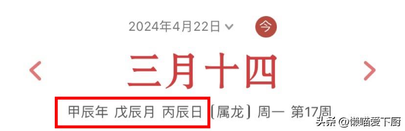 從萬年曆中也能看出,2024年4月22日,是農曆三月十四,也是干支紀法中的“甲辰年、戊辰月、丙辰日”,在年、月、日中均出現了地支“辰”,所以就有了這一天是“龍年龍月龍日”的說法。