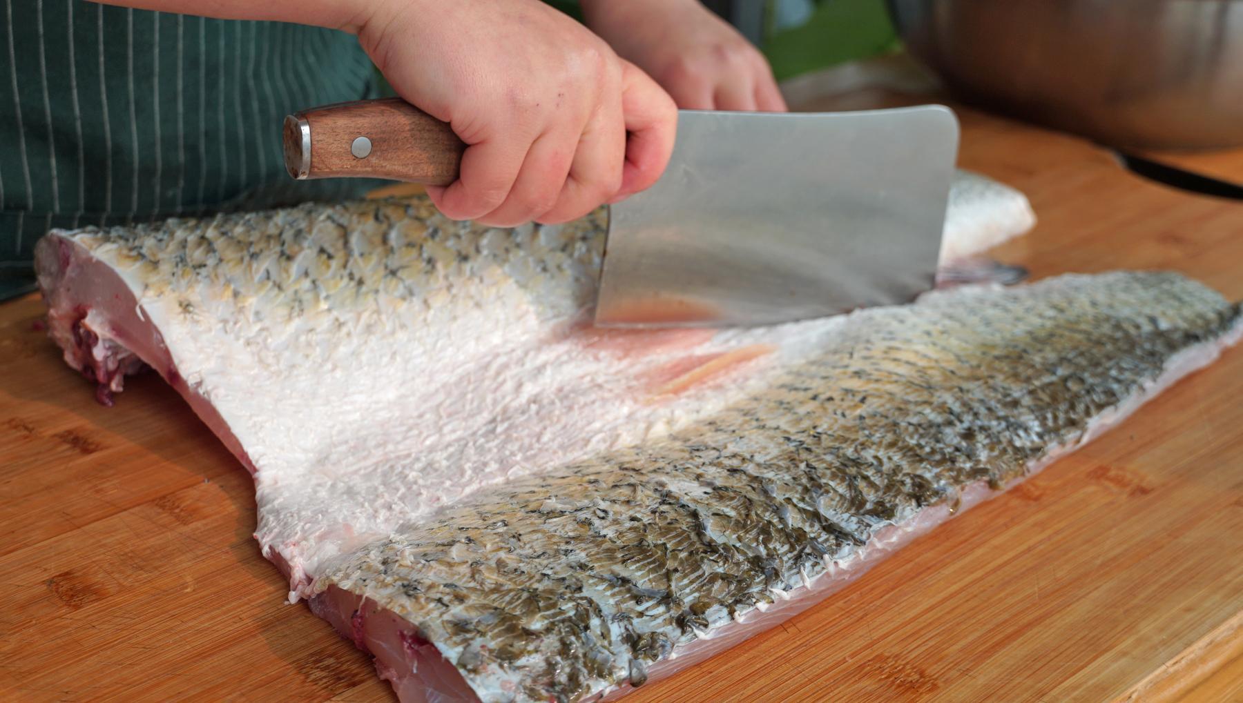 2、刀要貼着魚骨頭把魚肉都分出來,魚紅儘量不要留,接着把魚肉片下來就可以了。