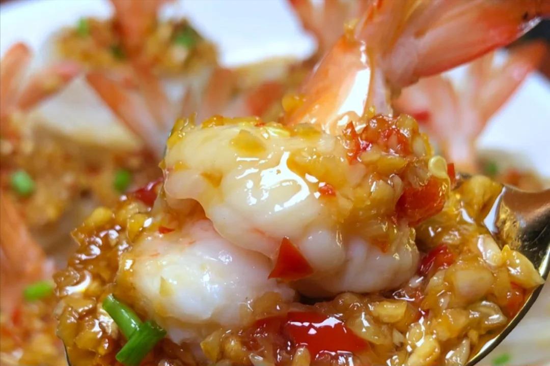 5、在蝦尾上鋪上蒜蓉,水開上鍋蒸3分鐘,關火燜2分鐘,淋上蒸魚豉油,澆上熱油,撒上蔥花即可。