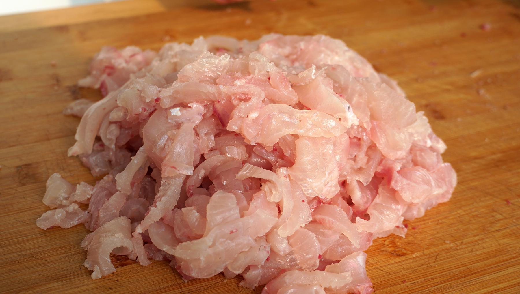 6、魚肉泡好後就撈出來擠幹水分,接着把魚肉到砧板上,再用刀剁碎。