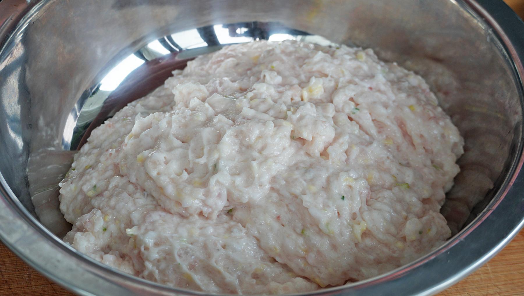9、我大概是連續攪拌了20分鐘左右,捏一個魚丸子把它放到水裏面,如果魚丸子能飄起來那就可以了。