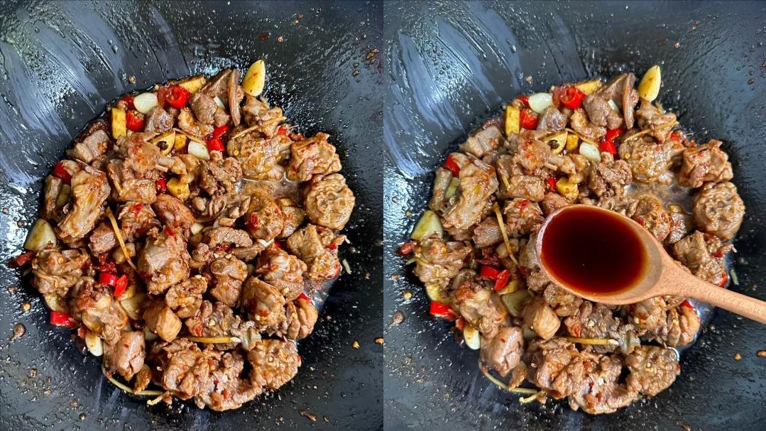 4、調味加一勺生抽,一勺蠔油,半勺老抽,少許鹽和雞精翻炒均勻。