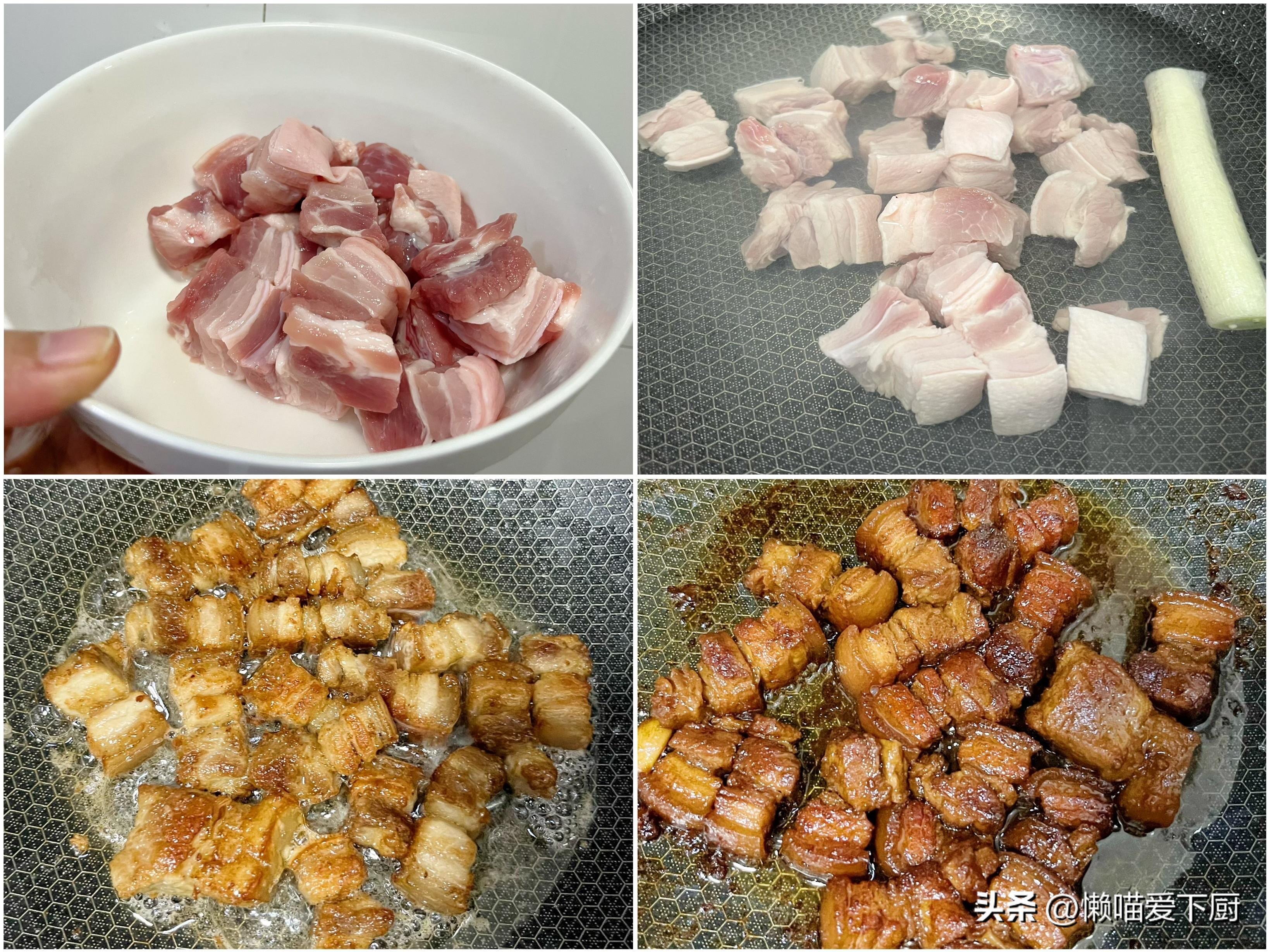 3、另起鍋燒油,加入五花肉,小火慢慢煸炒出油脂;