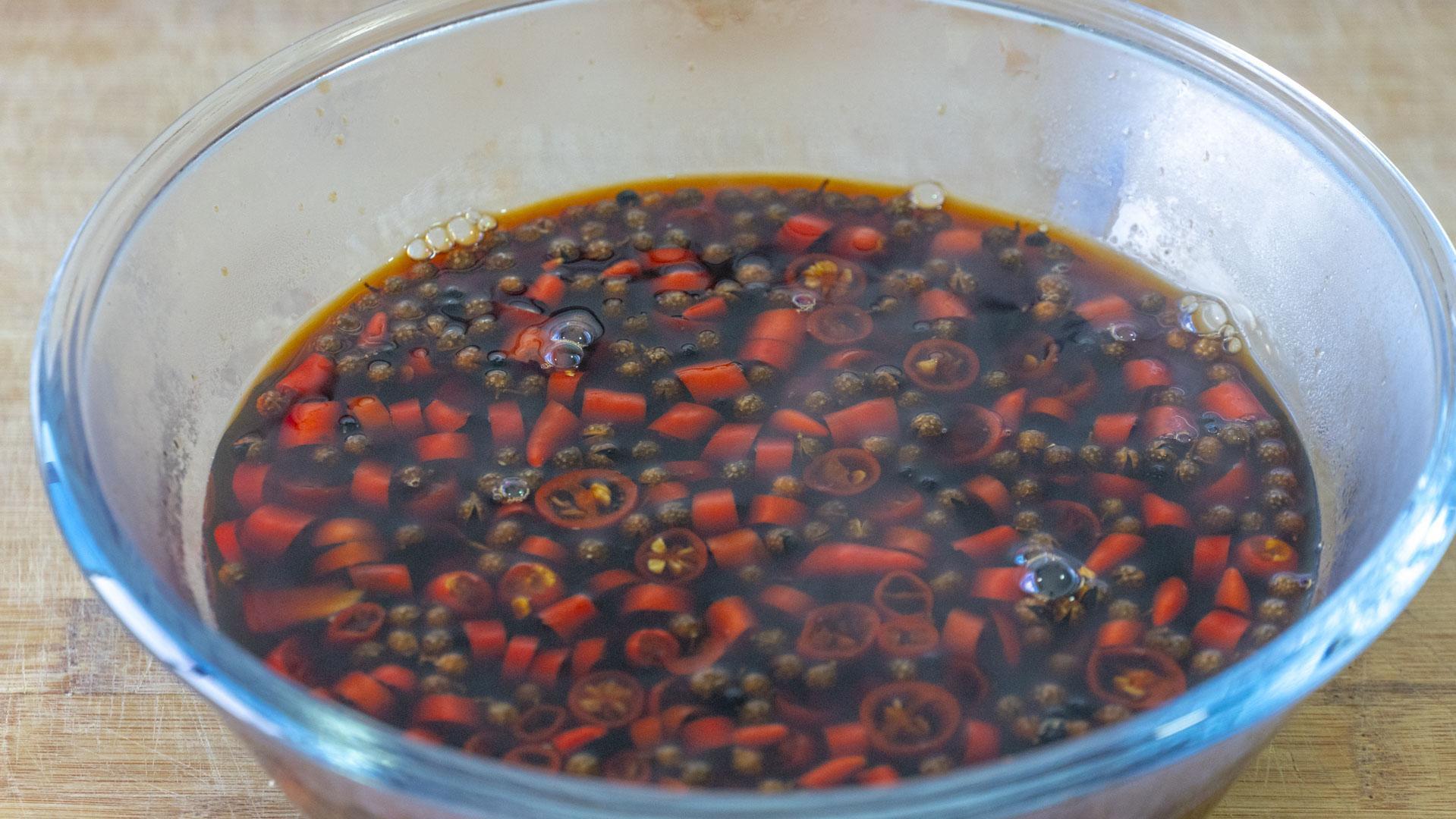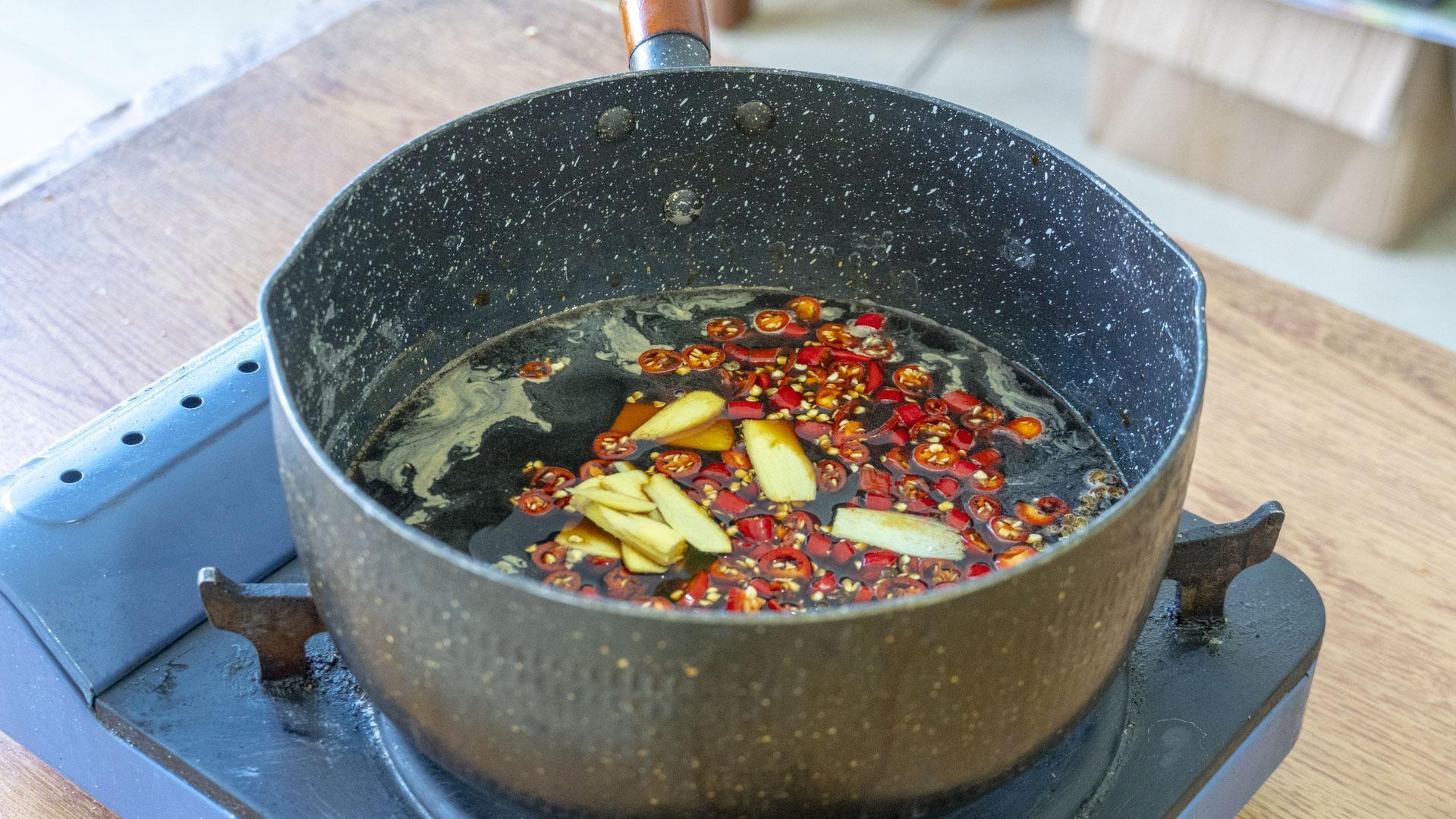 4、接着鍋裏倒入200克生抽、200克陳醋、30克白糖、1把花椒、50克小米辣、切好的薑片。