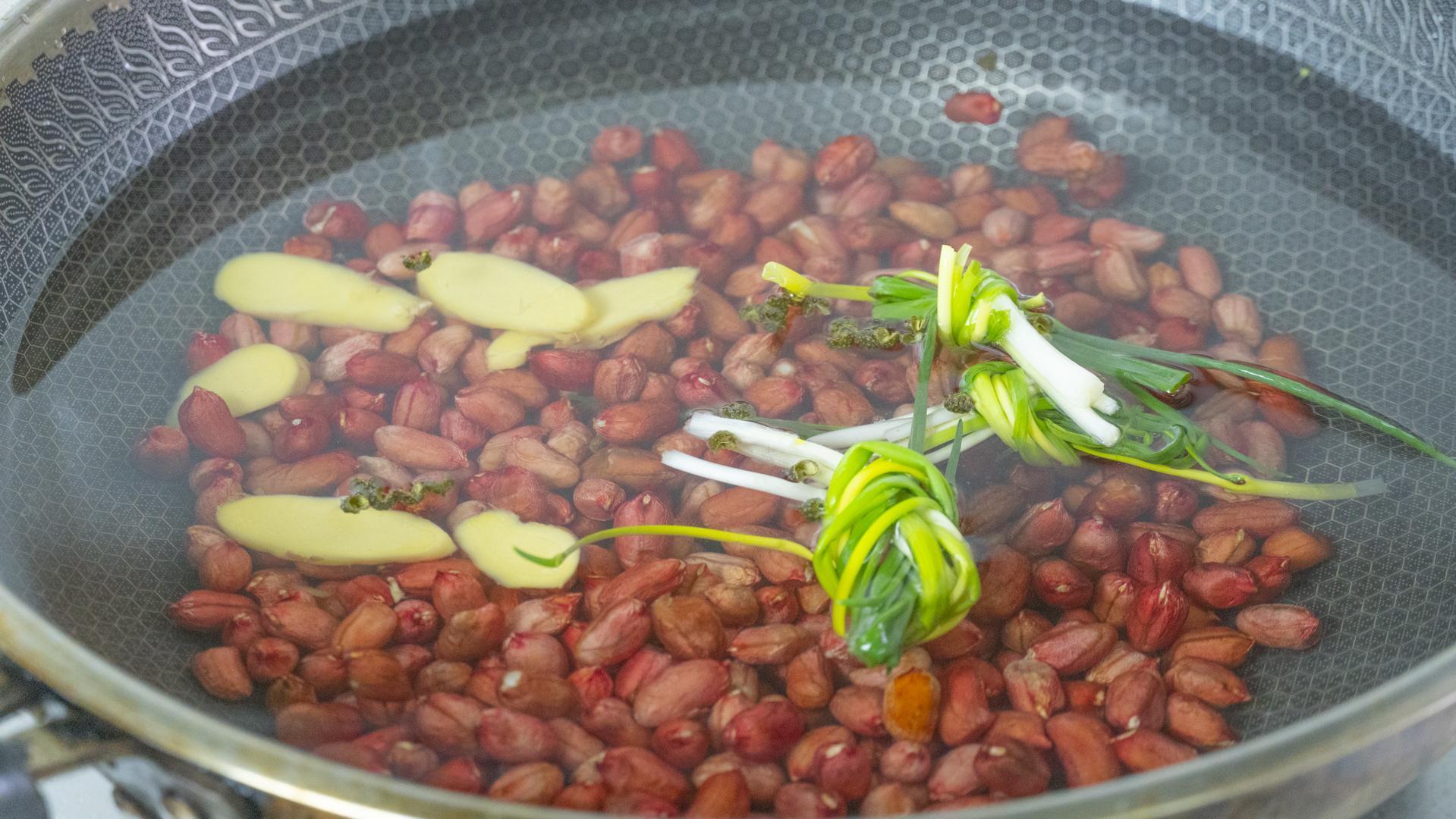 2、起鍋燒水,冷水倒入花生煮,接着加生薑、蔥結、八角、花椒、鹽、生抽、清水,中火煮20分鐘。