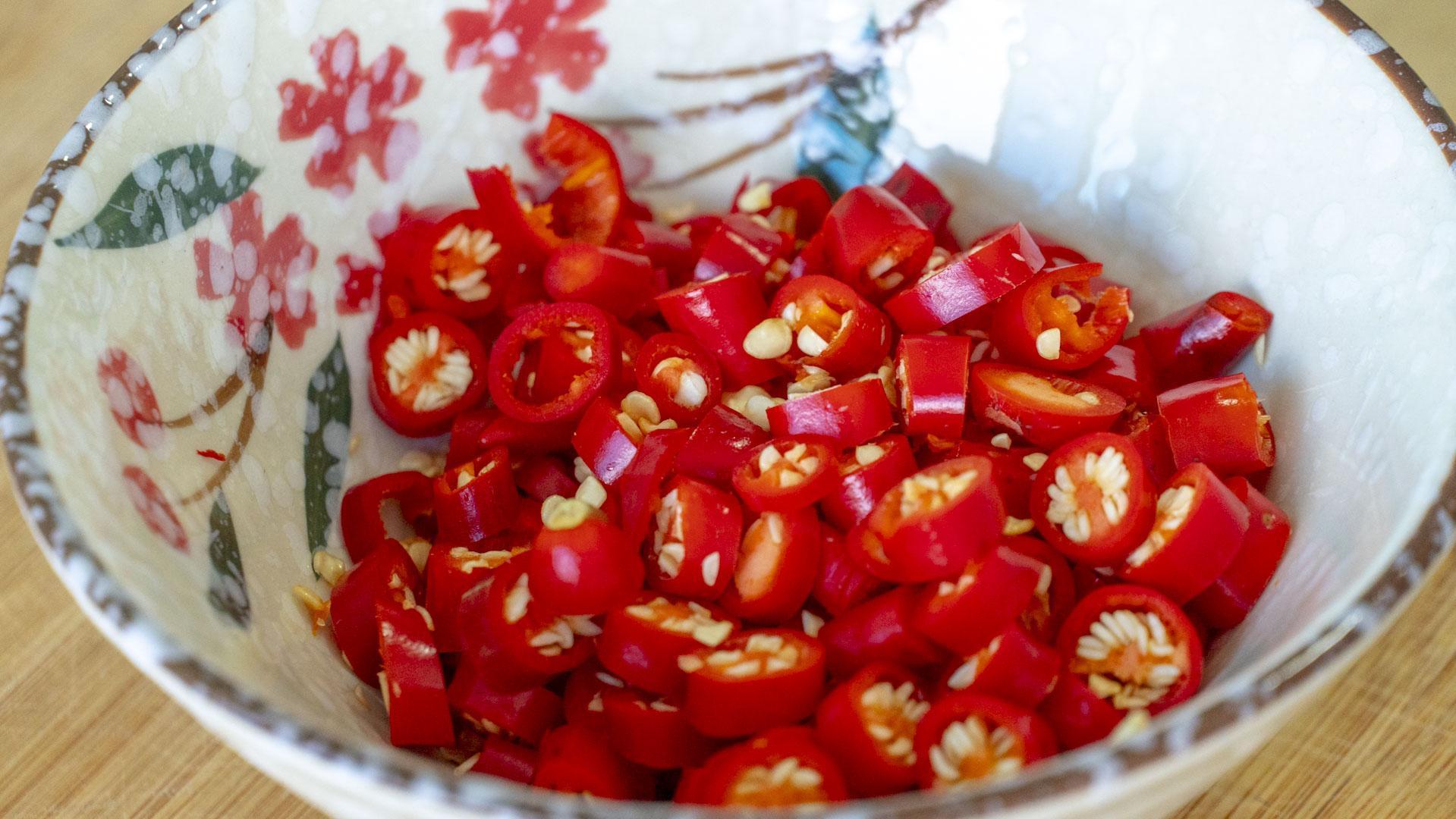 2、小米辣50克,洗淨後控一控水分,然後切成圈圈備用。
