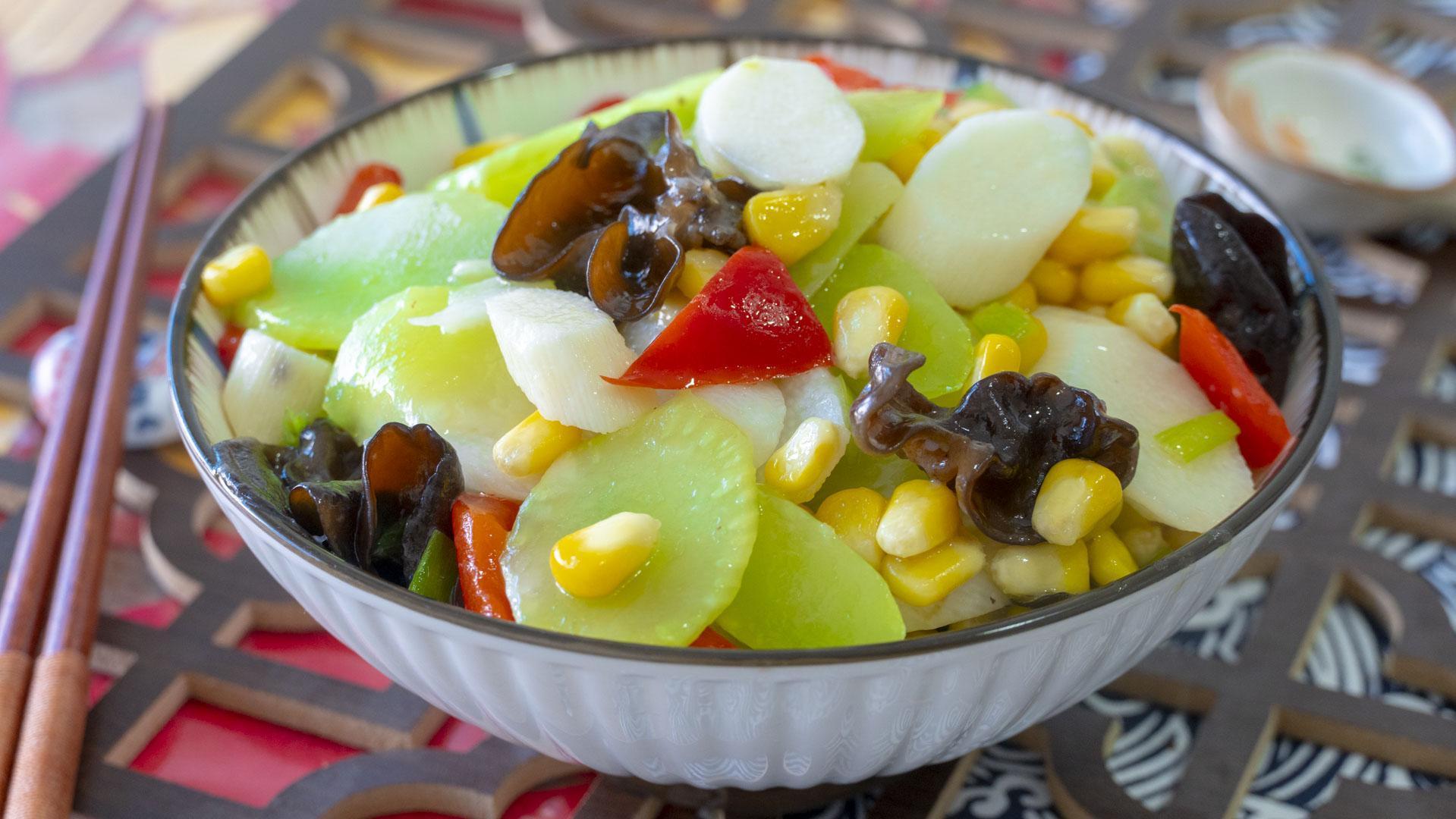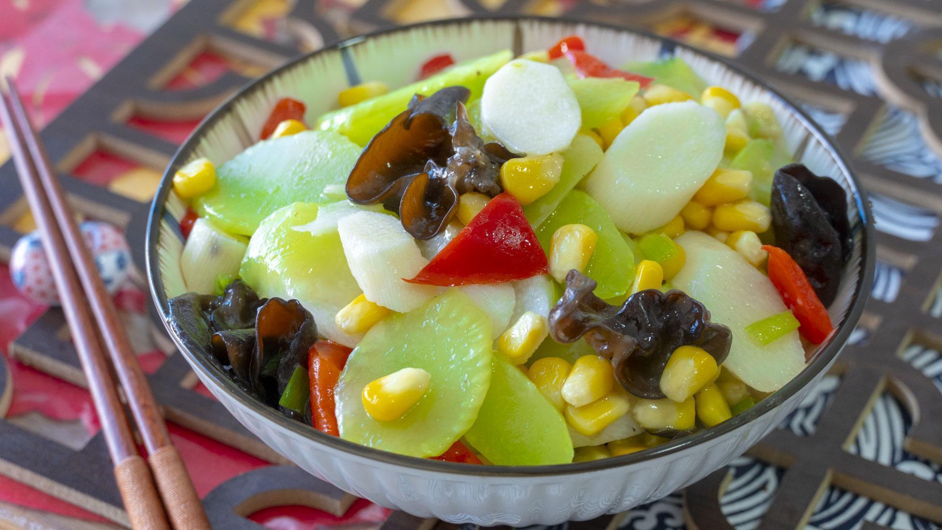 3、接着起鍋燒水,水開加一勺油,然後把山藥、萵筍、辣椒倒進來焯水,再來一把玉米和一把木耳,一起焯水一分鐘。斷生後撈出來再過一下涼水,顏色會更翠綠好看、撈出來瀝乾水分備用。