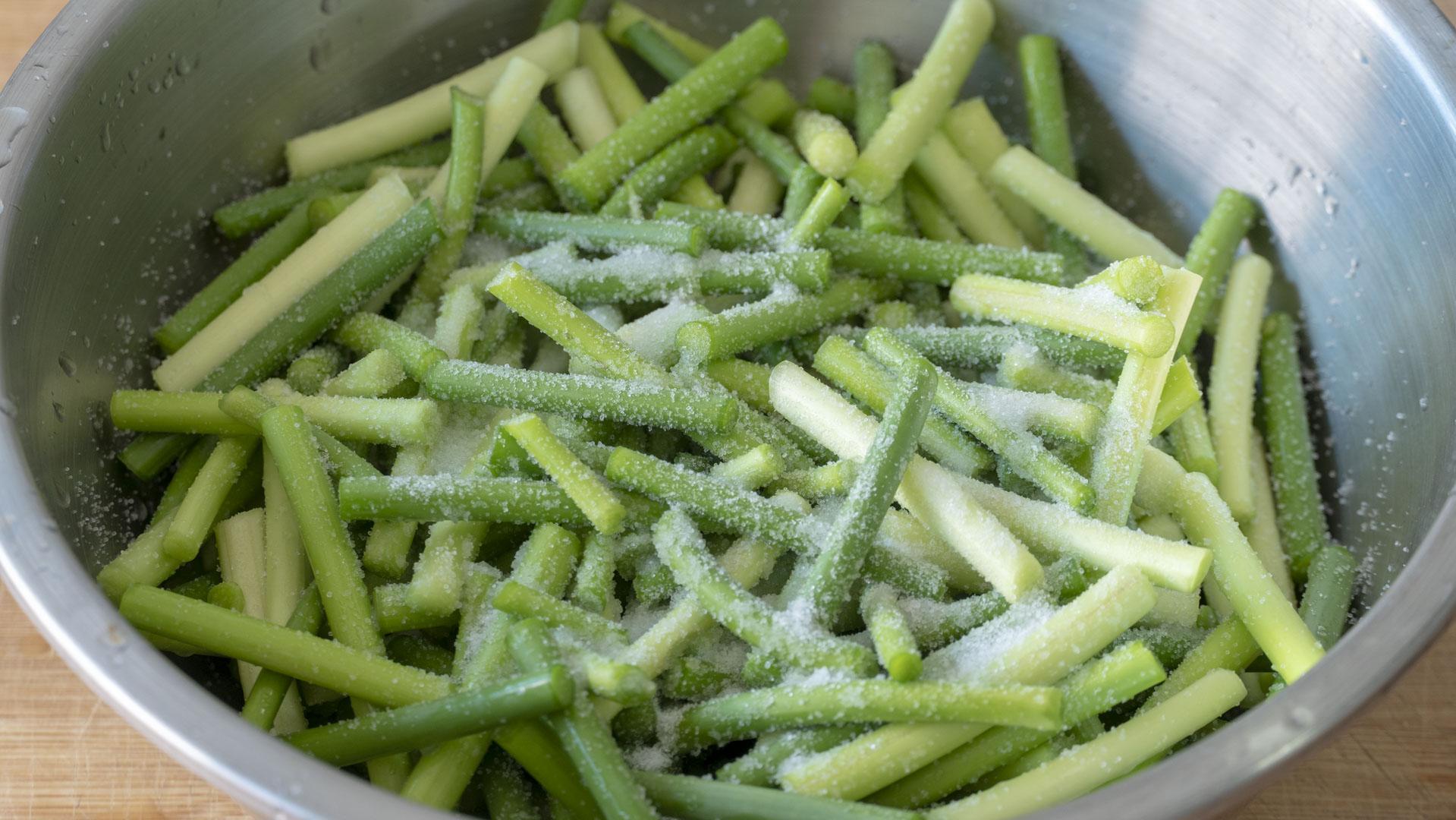 6、蒜薹醃好後出了許多水,撈出來瀝乾水分。