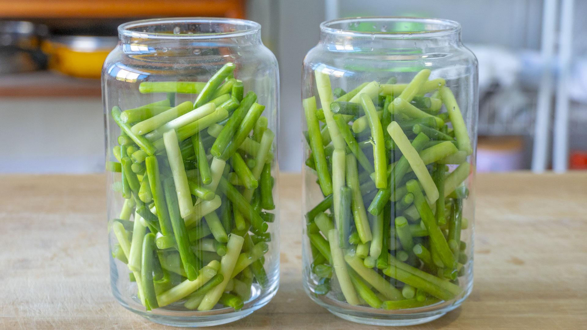 7、水分瀝乾後準備無水無油的玻璃瓶子,先把蒜薹放進來。