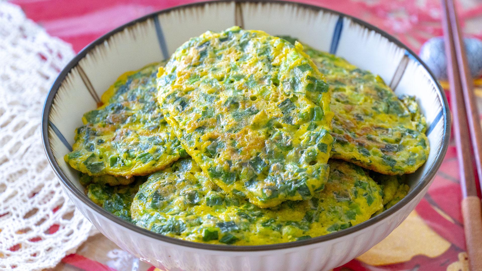 5、烙到一面定型後再翻另一面,這個韭菜餅是特別容易熟的,剛開始是定型,然後一