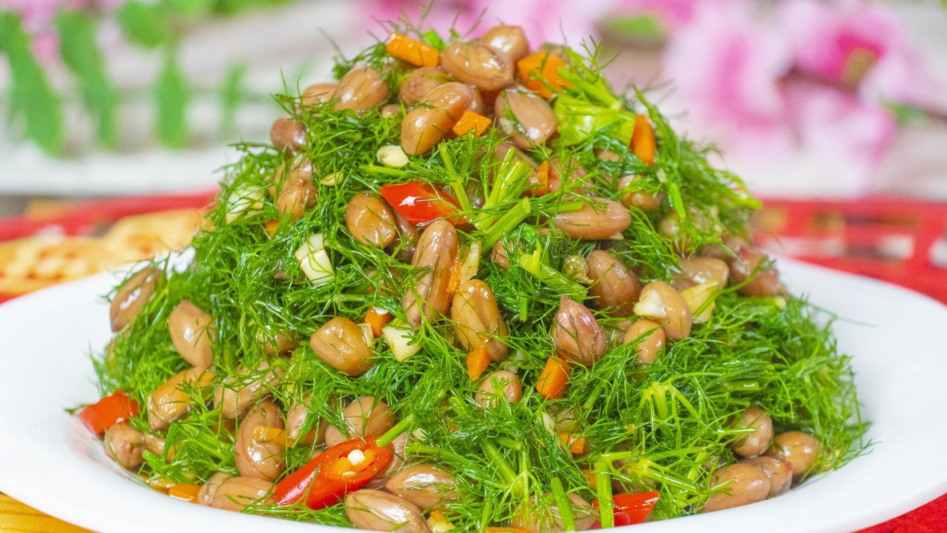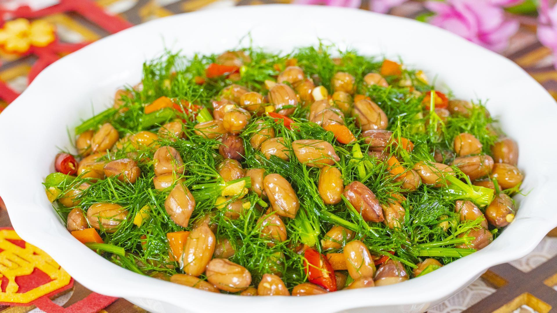 5、把放涼的花生和茴香倒一起、胡蘿蔔丁也倒進來,然後加蒜末、小米椒,接着淋上一勺熱油,香味兒激發出來後就可以調味兒了。加香醋、生抽、白糖、雞精、拌勻後就可以了。