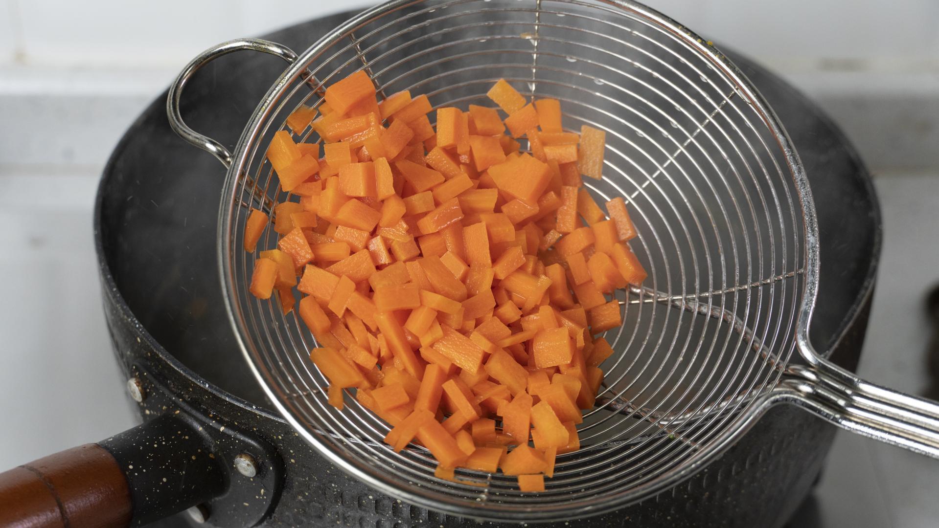 4、胡蘿蔔半根削皮切丁,水開倒進來焯水,大火煮2分鐘撈出。
