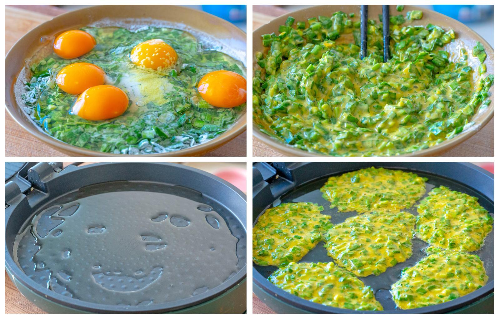 4、拌好後電餅鐺倒油,開中火舀入韭菜麪糊,用勺子稍微的攤開攤勻成一個小餅。