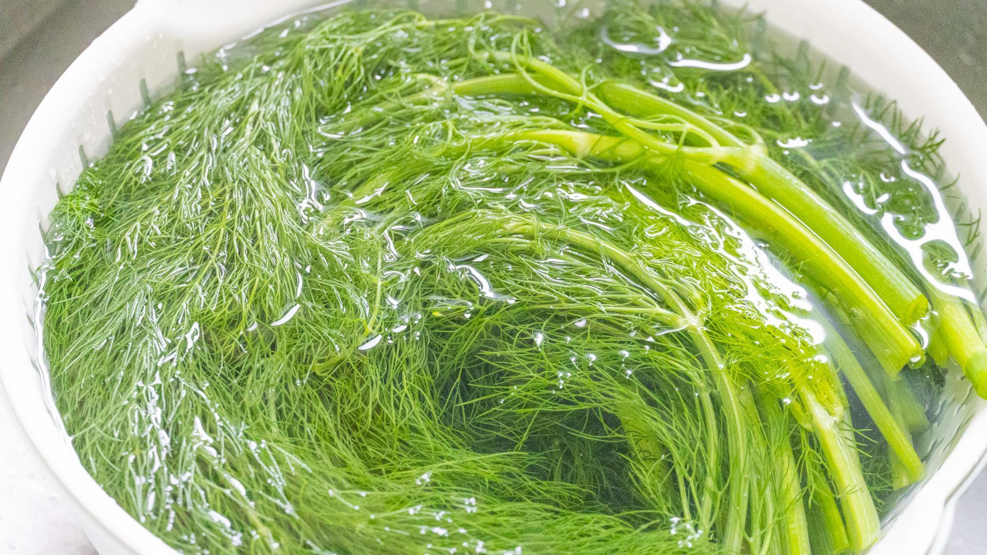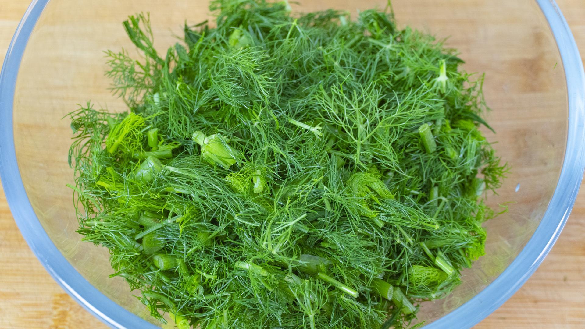 3、茴香葉一把,洗淨晾乾,切成小段兒裝碗,加一勺熟的食用油拌一拌。